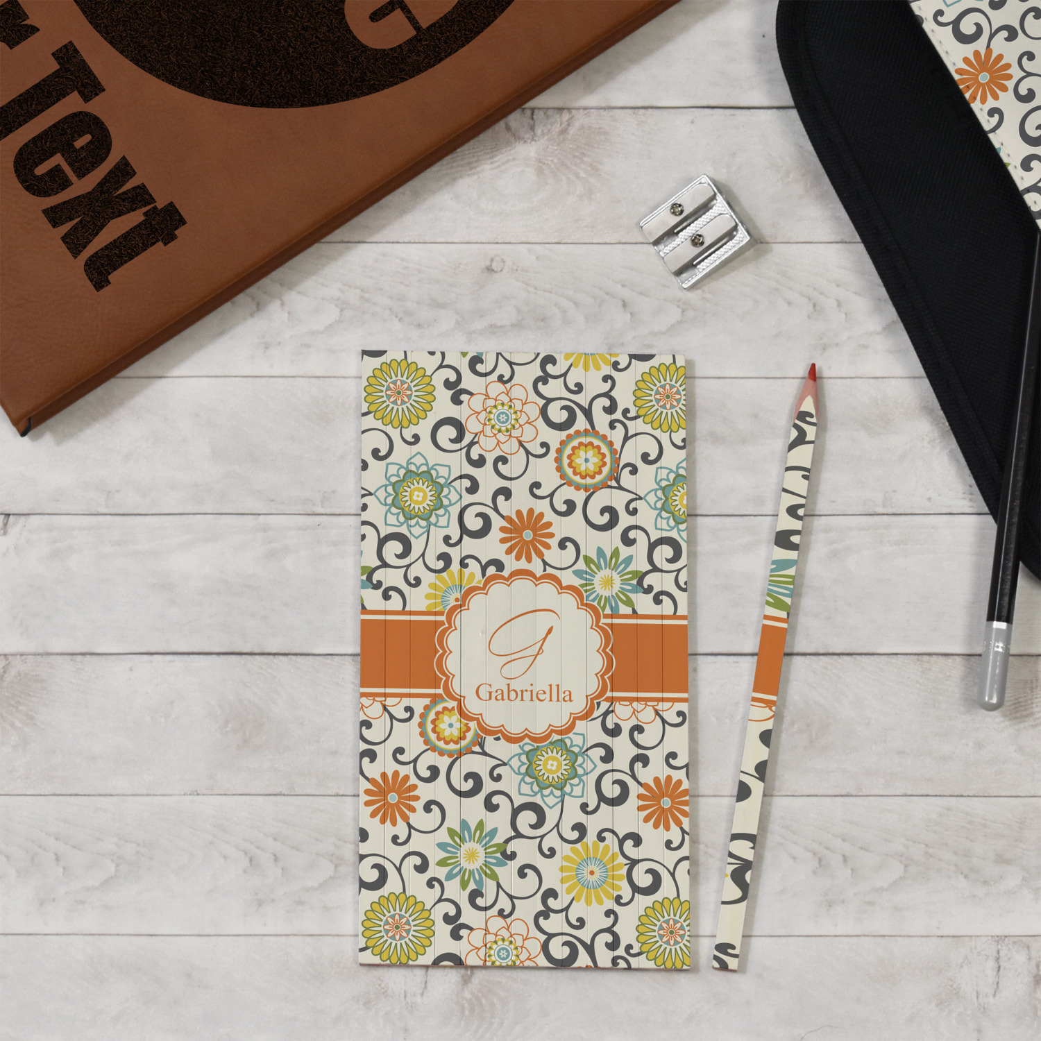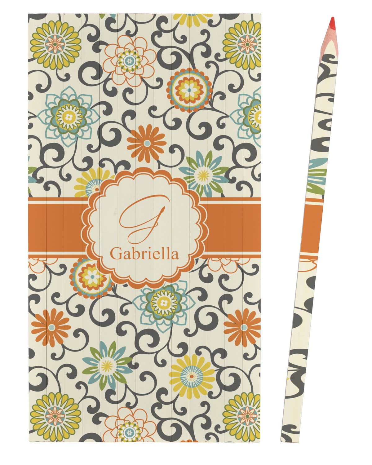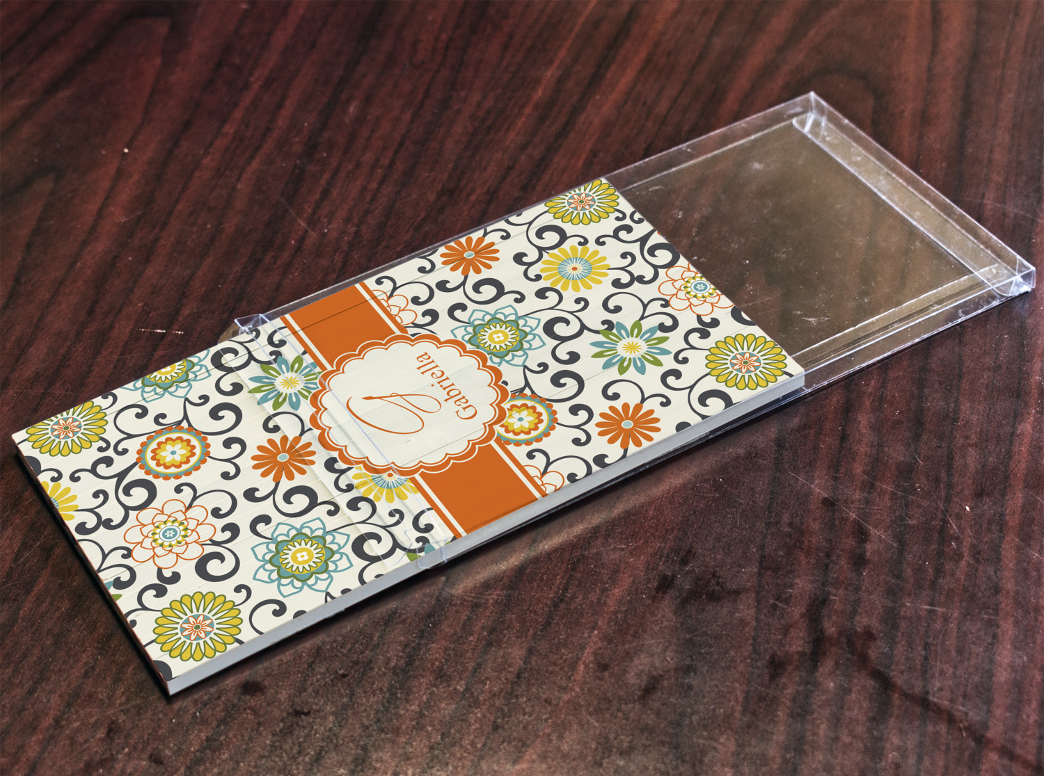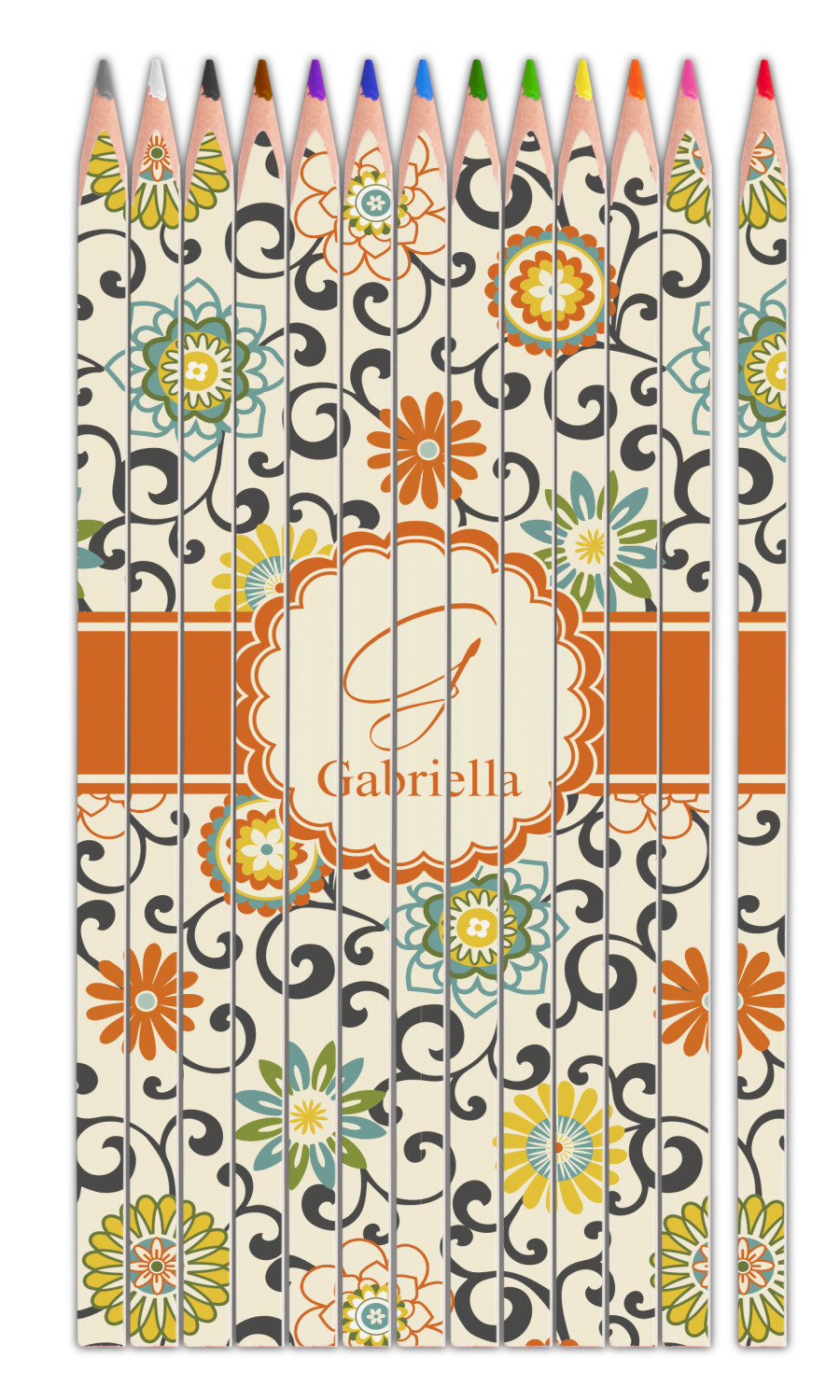 In this floral design the flowers of orange, green, blue, and yellow are connected with swirls of dark gray. The design has a classic ribbon in orange trimmed in off white. The decorative off white scalloped label is trimmed in orange. Add an initial and a name for that personal touch to pull the entire design together.