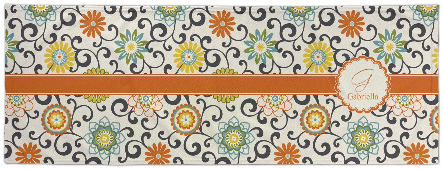 In this floral design the flowers of orange, green, blue, and yellow are connected with swirls of dark gray. The design has a classic ribbon in orange trimmed in off white. The decorative off white scalloped label is trimmed in orange. Add an initial and a name for that personal touch to pull the entire design together.