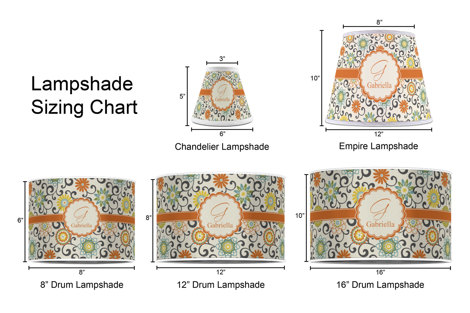 Our customized lamp shades also come in 3 different sizes: 8", 12" and 16", measuring at 8" in diameter by 6" tall, 12" in diameter by 8" tall, and 16" in diameter by 10" tall, respectively.