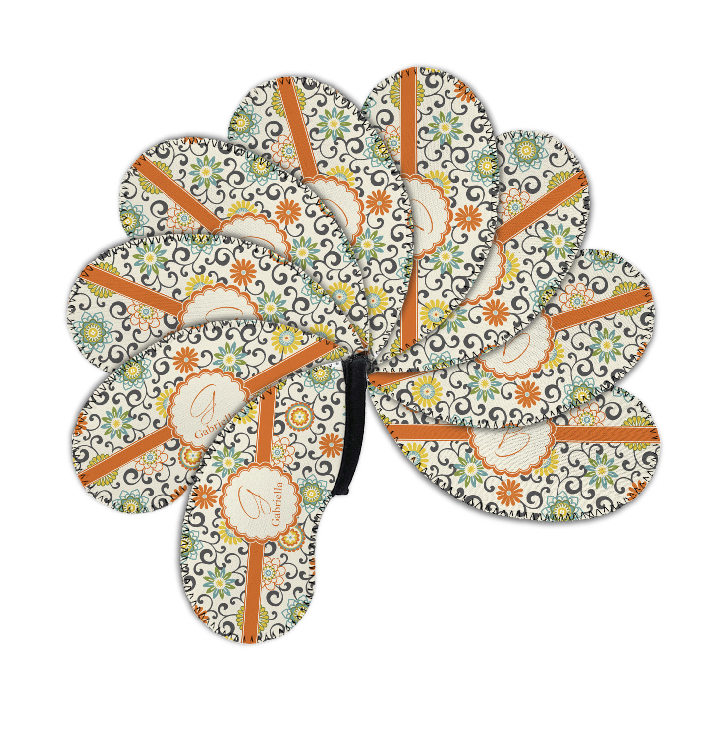 In this floral design the flowers of orange, green, blue, and yellow are connected with swirls of dark gray. The design has a classic ribbon in orange trimmed in off white. The decorative off white scalloped label is trimmed in orange. Add an initial and a name for that personal touch to pull the entire design together.