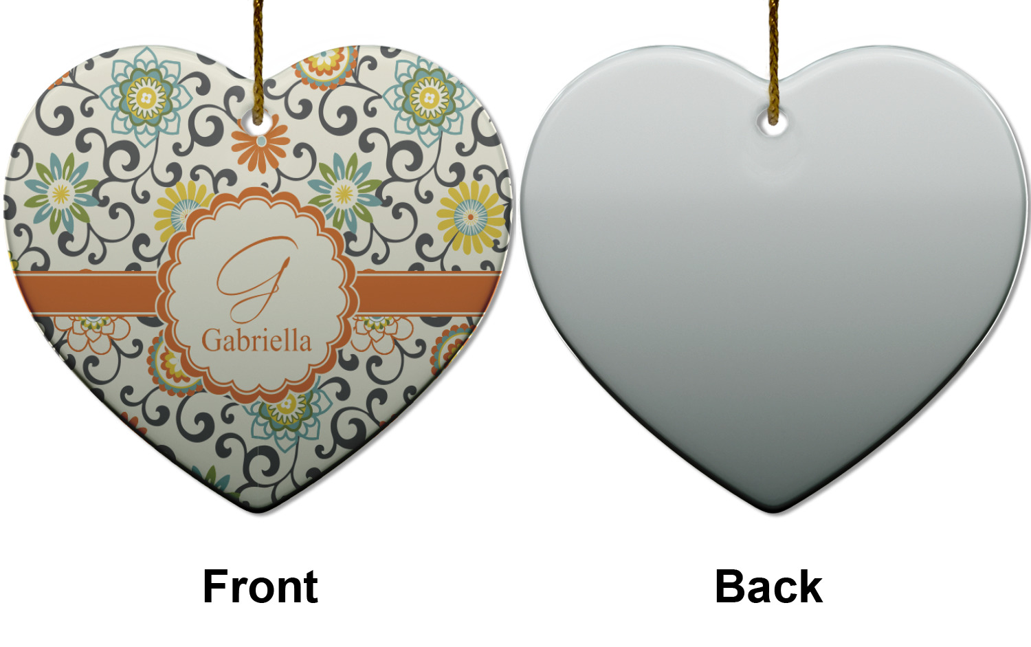 In this floral design the flowers of orange, green, blue, and yellow are connected with swirls of dark gray. The design has a classic ribbon in orange trimmed in off white. The decorative off white scalloped label is trimmed in orange. Add an initial and a name for that personal touch to pull the entire design together.
