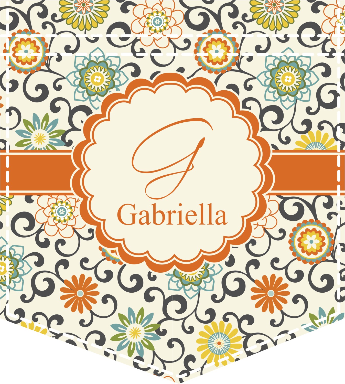 In this floral design the flowers of orange, green, blue, and yellow are connected with swirls of dark gray. The design has a classic ribbon in orange trimmed in off white. The decorative off white scalloped label is trimmed in orange. Add an initial and a name for that personal touch to pull the entire design together.