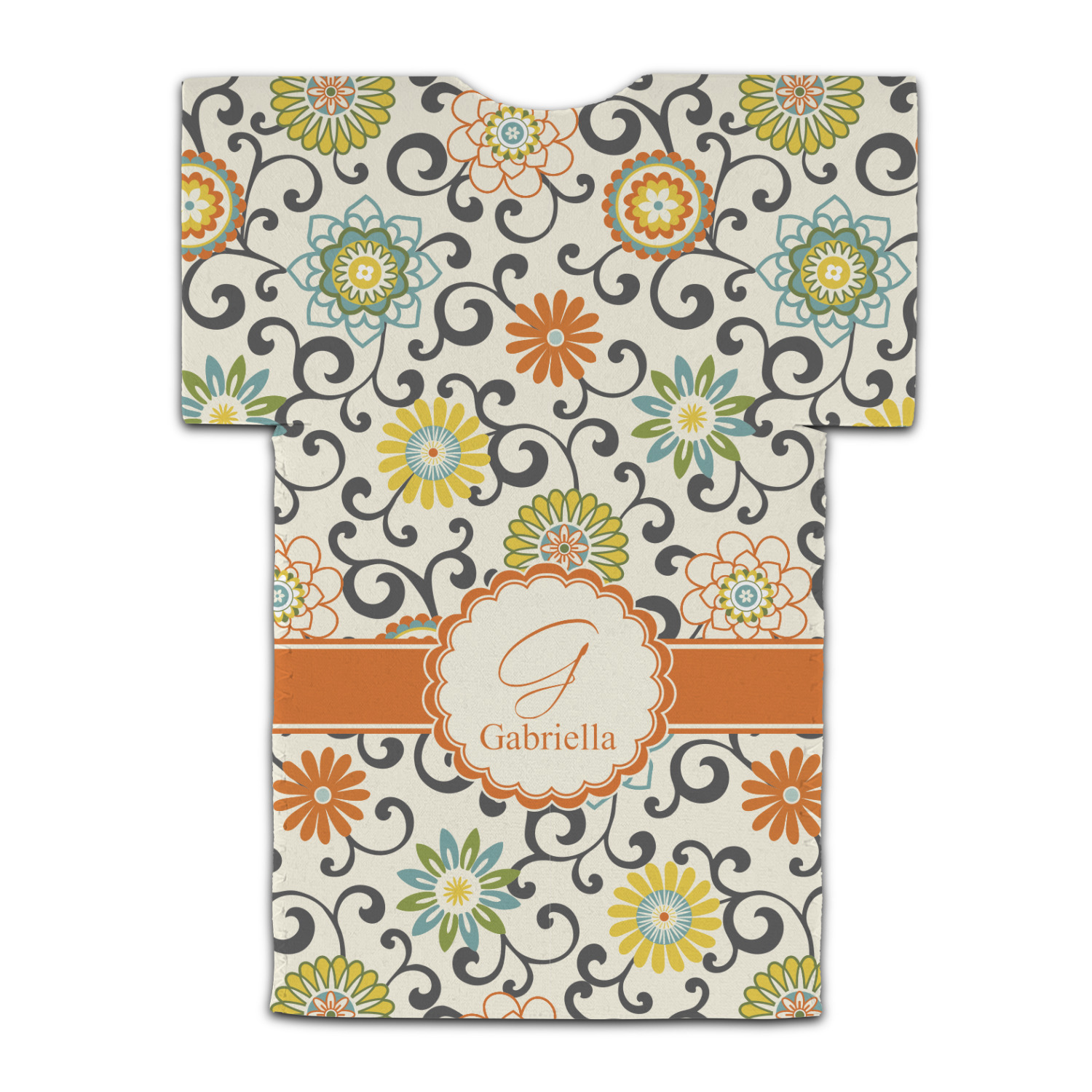 In this floral design the flowers of orange, green, blue, and yellow are connected with swirls of dark gray. The design has a classic ribbon in orange trimmed in off white. The decorative off white scalloped label is trimmed in orange. Add an initial and a name for that personal touch to pull the entire design together.