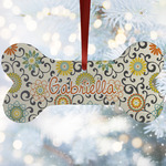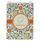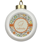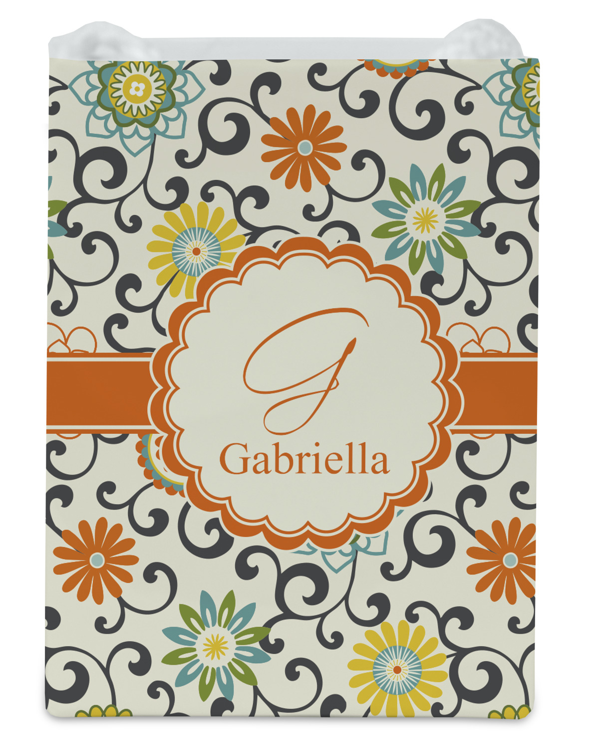 In this floral design the flowers of orange, green, blue, and yellow are connected with swirls of dark gray. The design has a classic ribbon in orange trimmed in off white. The decorative off white scalloped label is trimmed in orange. Add an initial and a name for that personal touch to pull the entire design together.