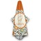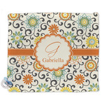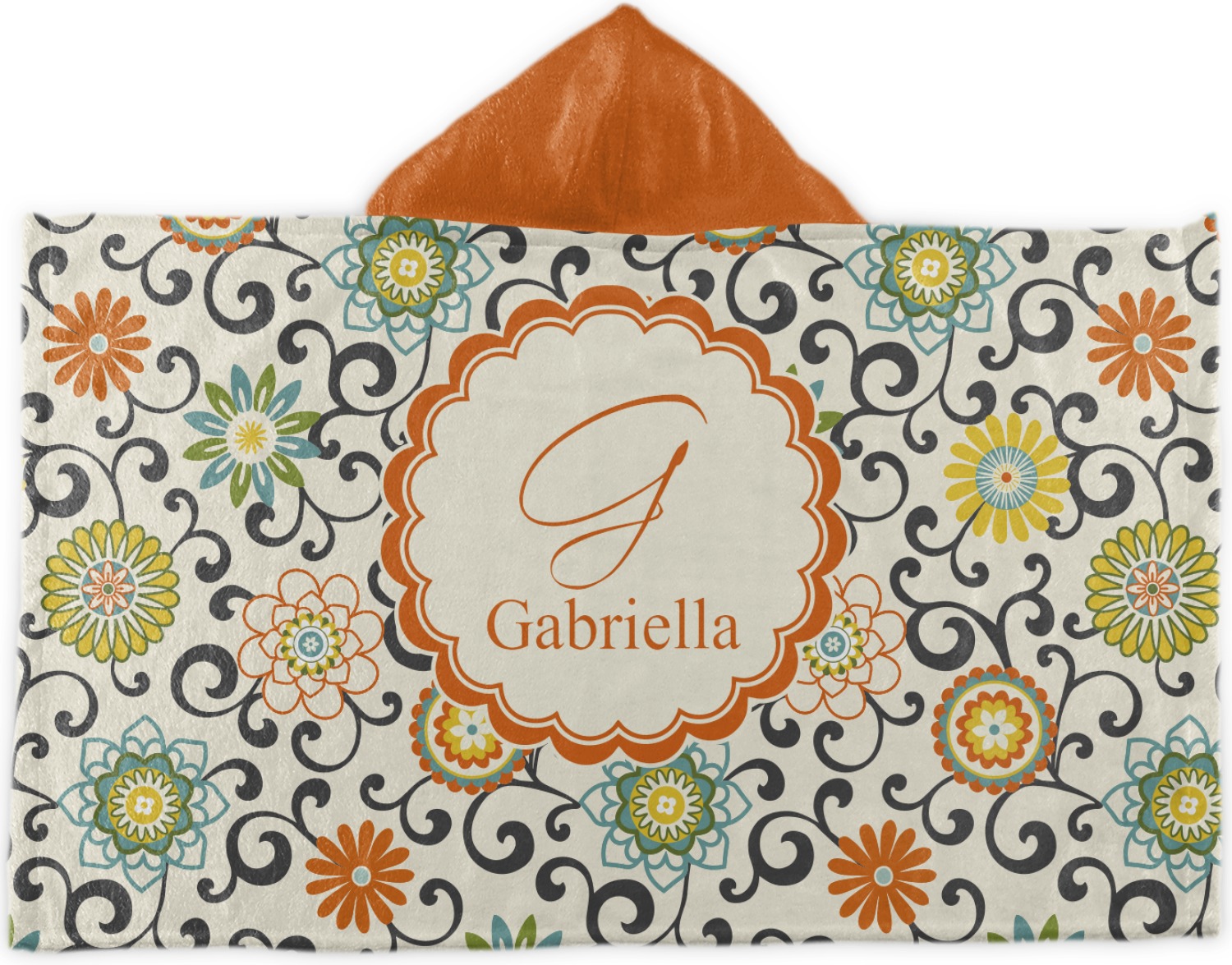 In this floral design the flowers of orange, green, blue, and yellow are connected with swirls of dark gray. The design has a classic ribbon in orange trimmed in off white. The decorative off white scalloped label is trimmed in orange. Add an initial and a name for that personal touch to pull the entire design together.