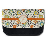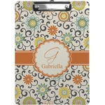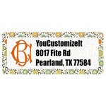 In this floral design the flowers of orange, green, blue, and yellow are connected with swirls of dark gray. The design has a classic ribbon in orange trimmed in off white. The decorative off white scalloped label is trimmed in orange. Add an initial and a name for that personal touch to pull the entire design together.