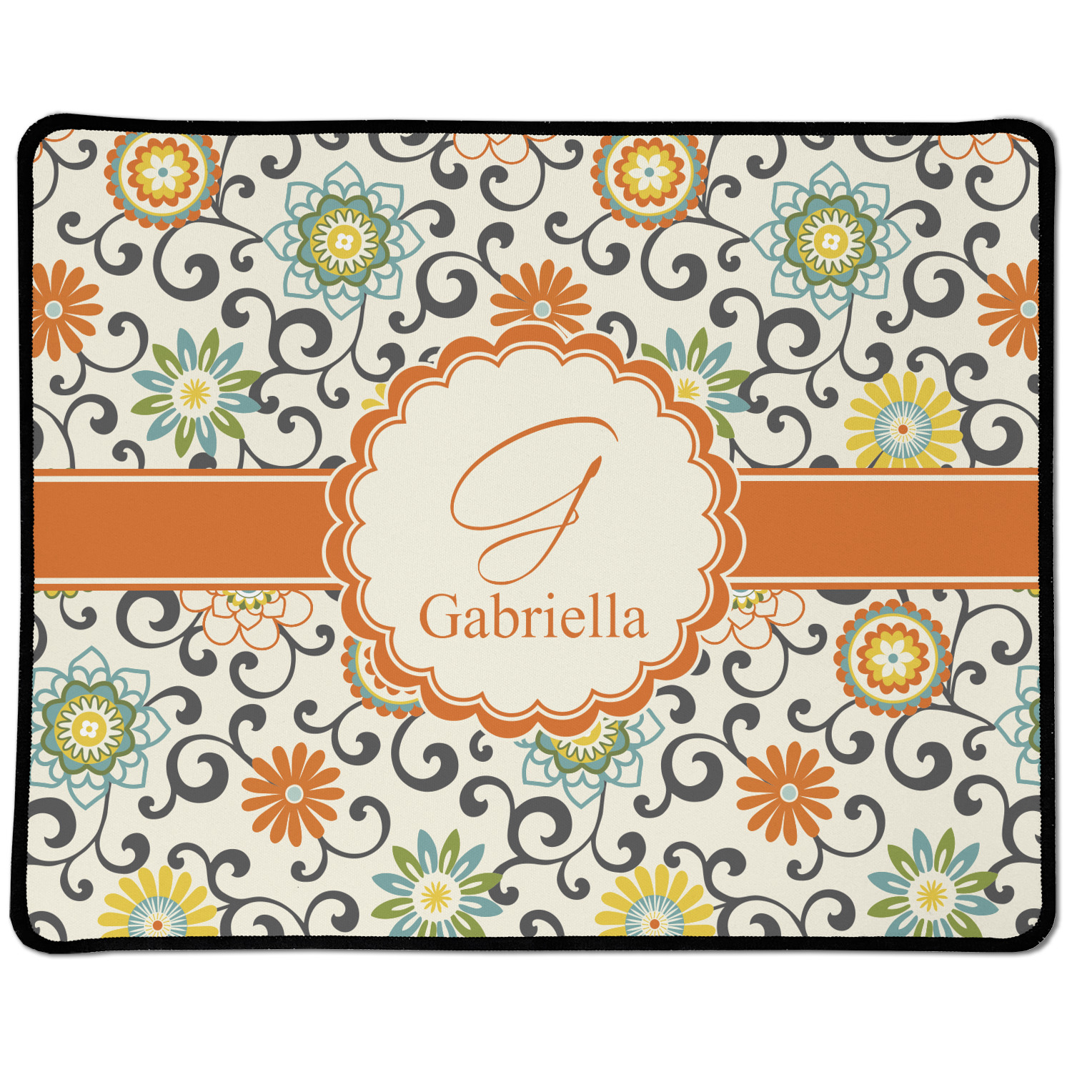 In this floral design the flowers of orange, green, blue, and yellow are connected with swirls of dark gray. The design has a classic ribbon in orange trimmed in off white. The decorative off white scalloped label is trimmed in orange. Add an initial and a name for that personal touch to pull the entire design together.