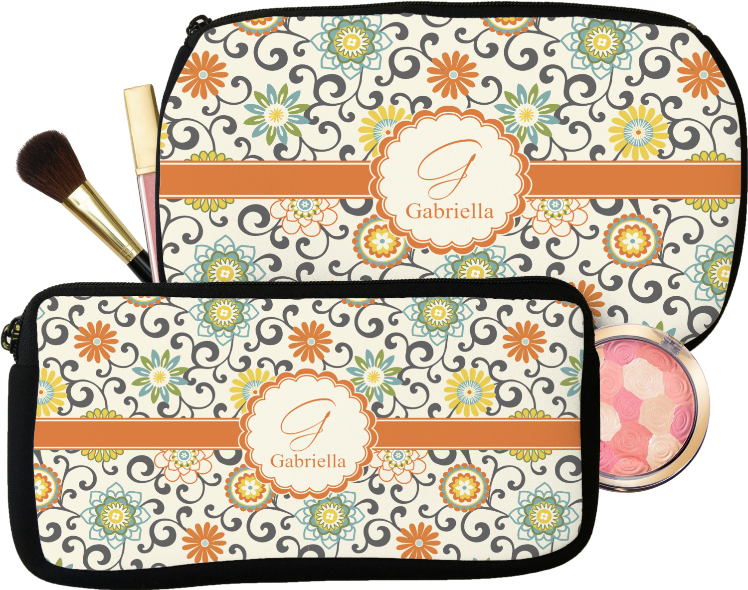 Our personalized makeup bags are available in many different designs, patterns and colors - so you are sure to find one that will love. They are made of neoprene (same material as wet-suits) and thus are water resistant, so spillages in your makeup bag will not end up all over you purse. They are customized on one side and are black on the other side and the zipper is black as well.