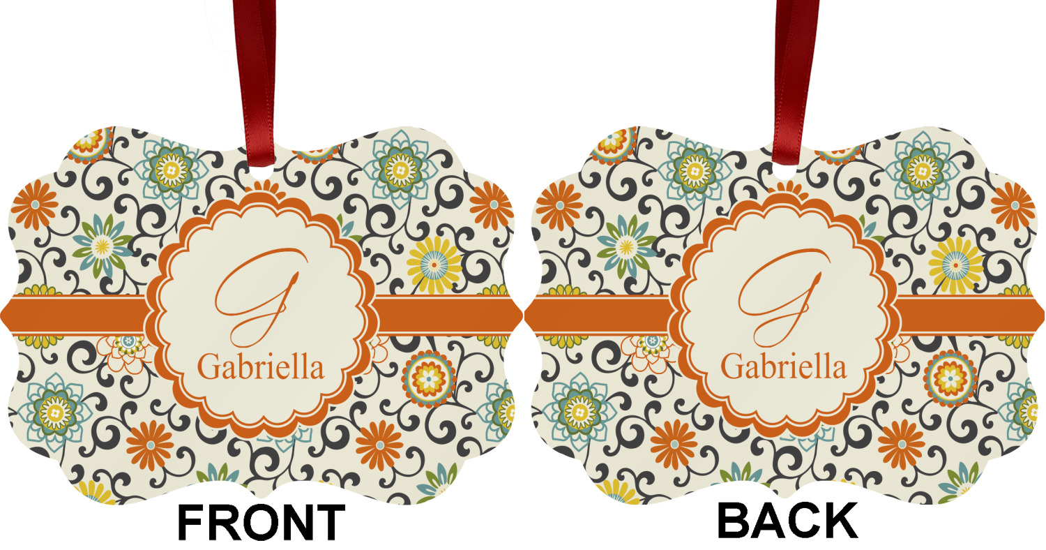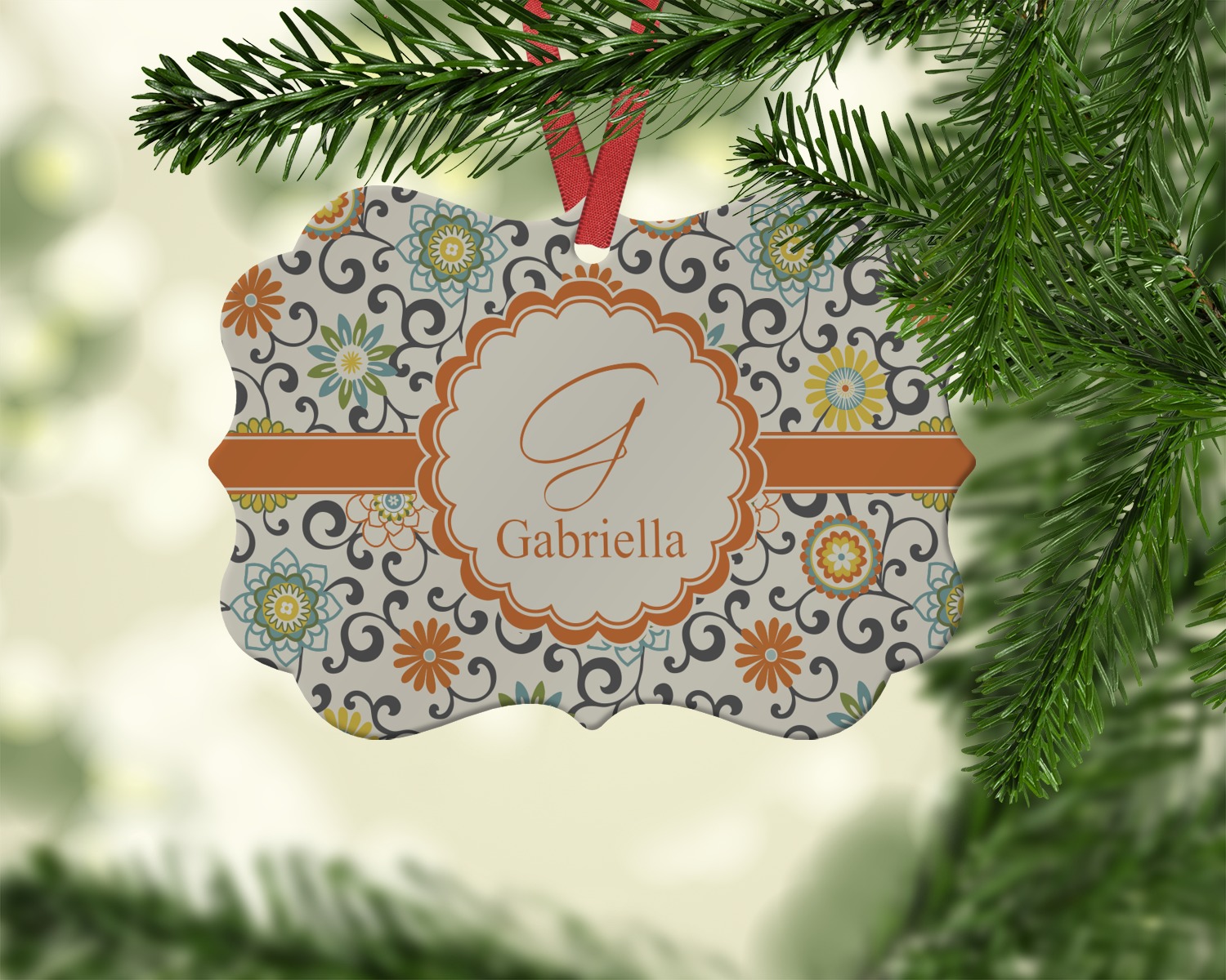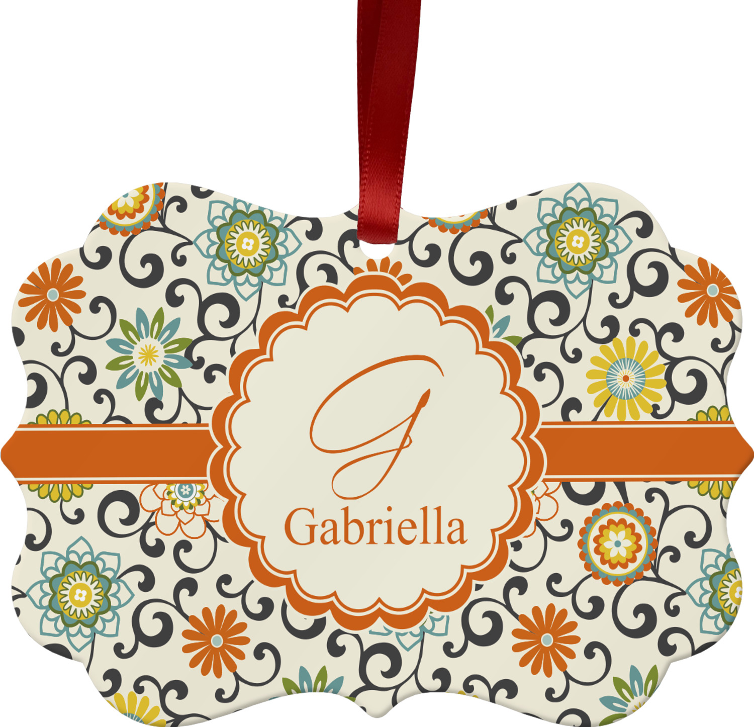 In this floral design the flowers of orange, green, blue, and yellow are connected with swirls of dark gray. The design has a classic ribbon in orange trimmed in off white. The decorative off white scalloped label is trimmed in orange. Add an initial and a name for that personal touch to pull the entire design together.