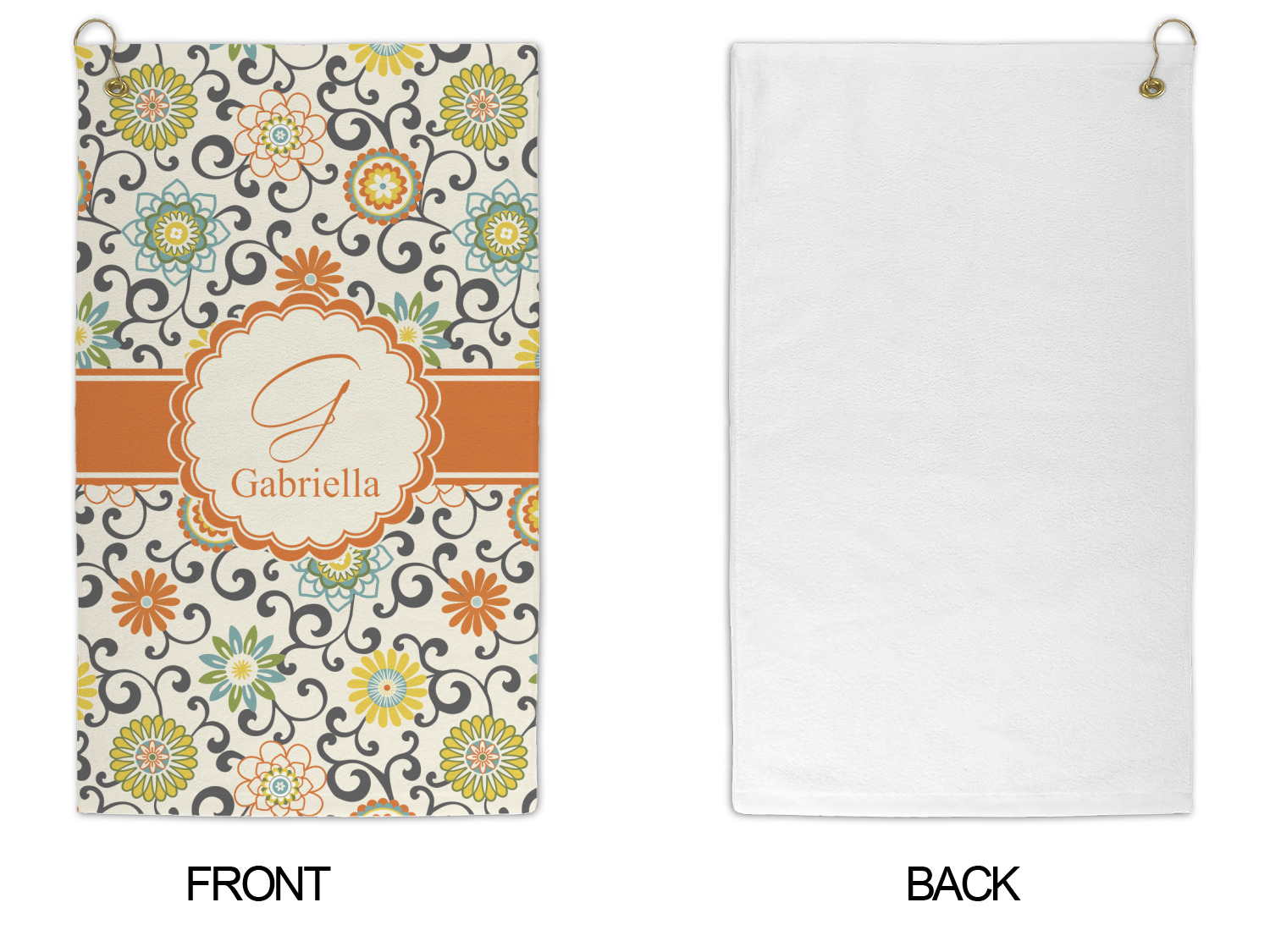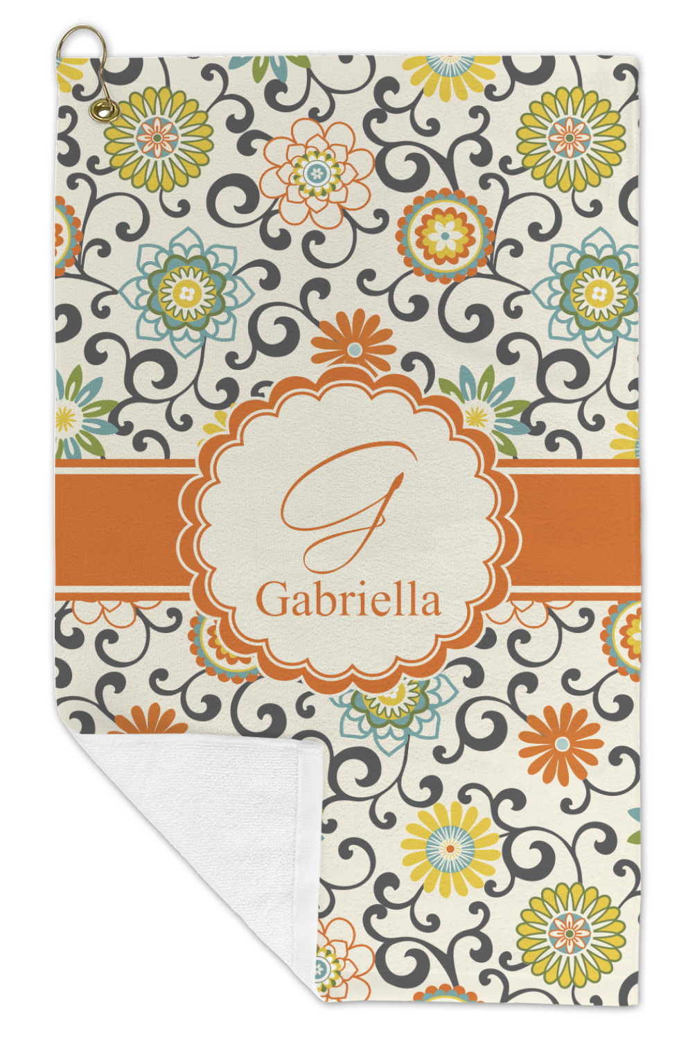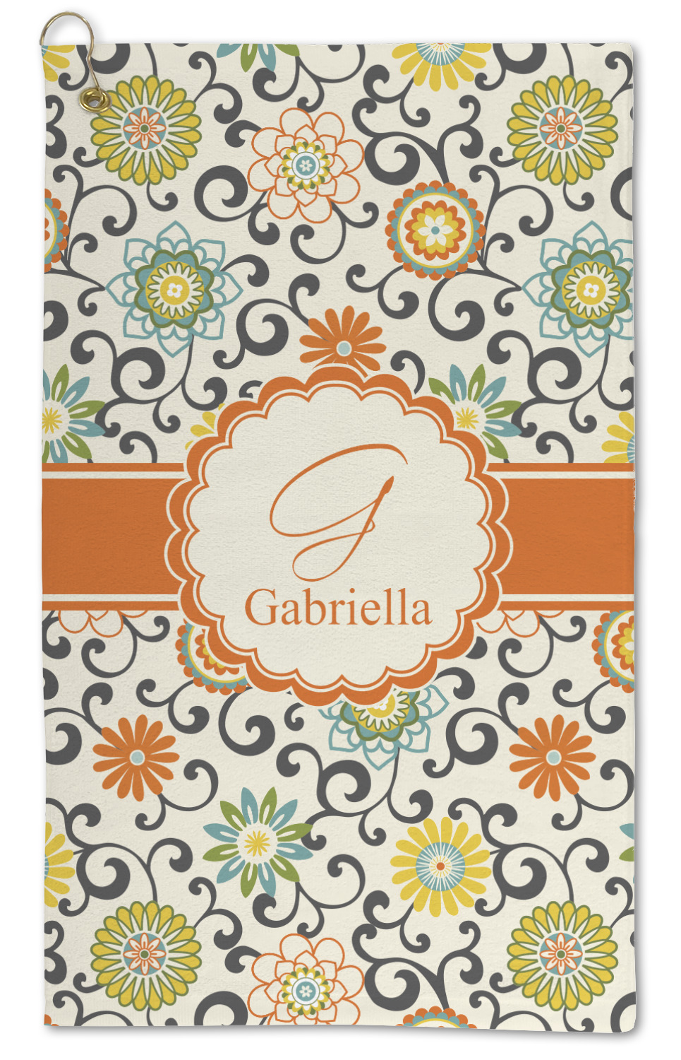 In this floral design the flowers of orange, green, blue, and yellow are connected with swirls of dark gray. The design has a classic ribbon in orange trimmed in off white. The decorative off white scalloped label is trimmed in orange. Add an initial and a name for that personal touch to pull the entire design together.
