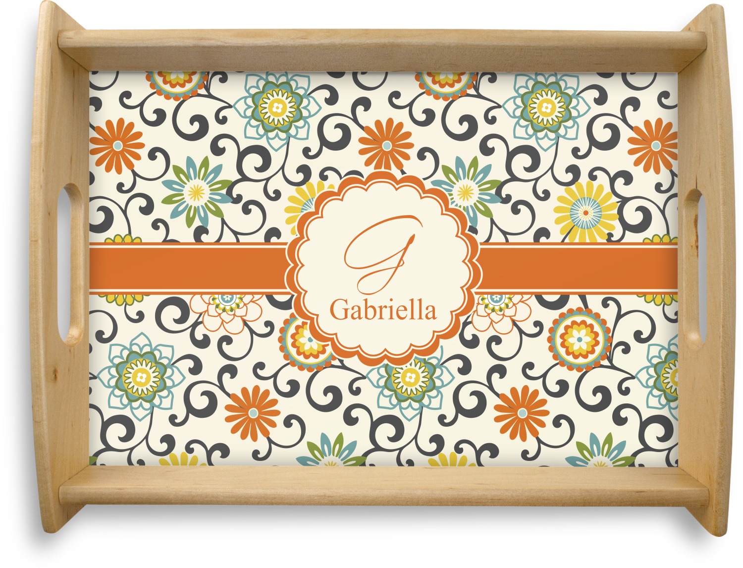 This serving tray with handles features square edges and two rounded sides, creating a very modern look. Each side is fabricated from a beautifully cut, natural wood. The bottom of the interior of the tray displays your customized design in bright, vibrant color. The tray is sold in both a black color and a natural wood look. Each variation of the wood serving tray has two sizes: Small, which is 14" x 10" x 2.25", and Large, which is 19.5" x 13.5" x 2.75".