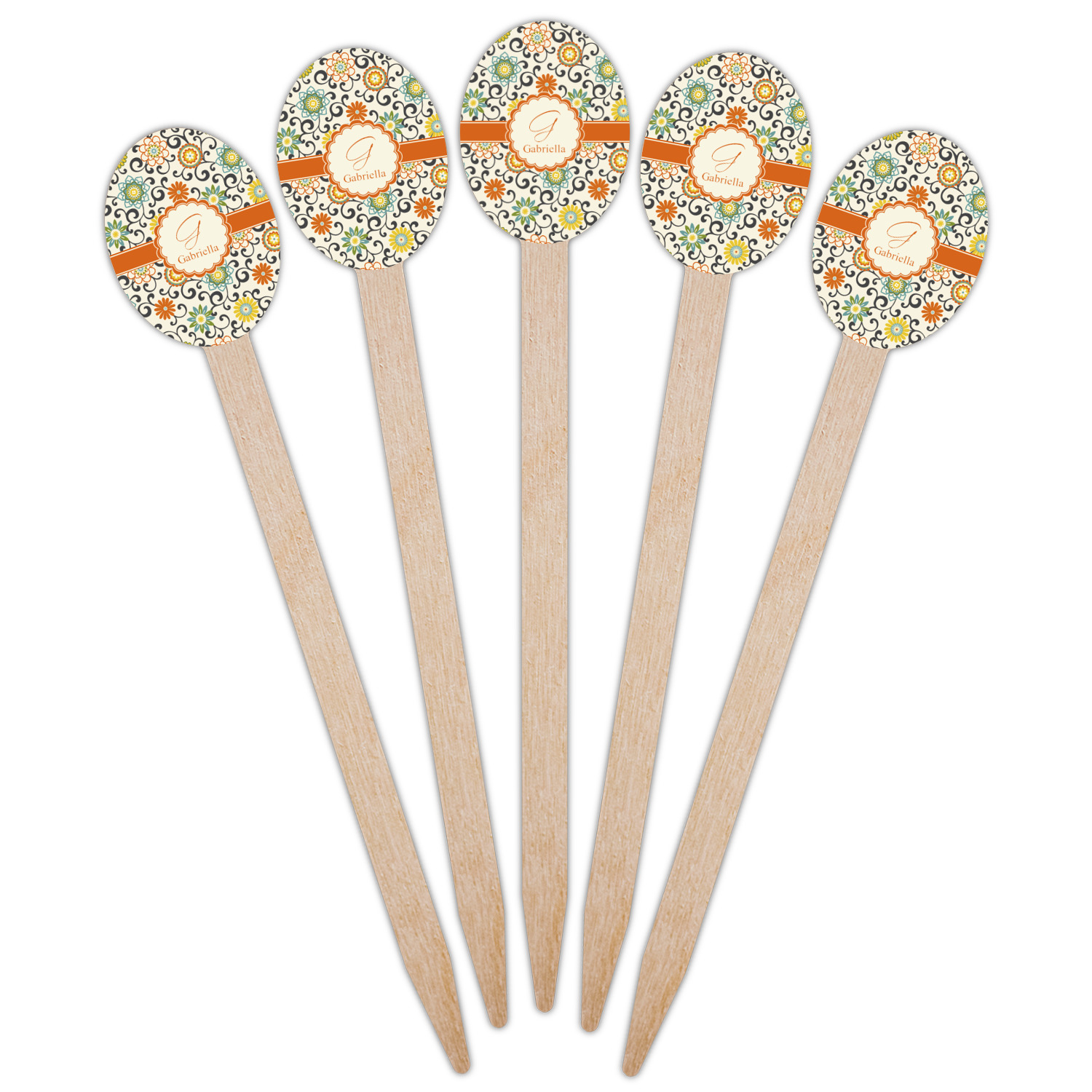 In this floral design the flowers of orange, green, blue, and yellow are connected with swirls of dark gray. The design has a classic ribbon in orange trimmed in off white. The decorative off white scalloped label is trimmed in orange. Add an initial and a name for that personal touch to pull the entire design together.