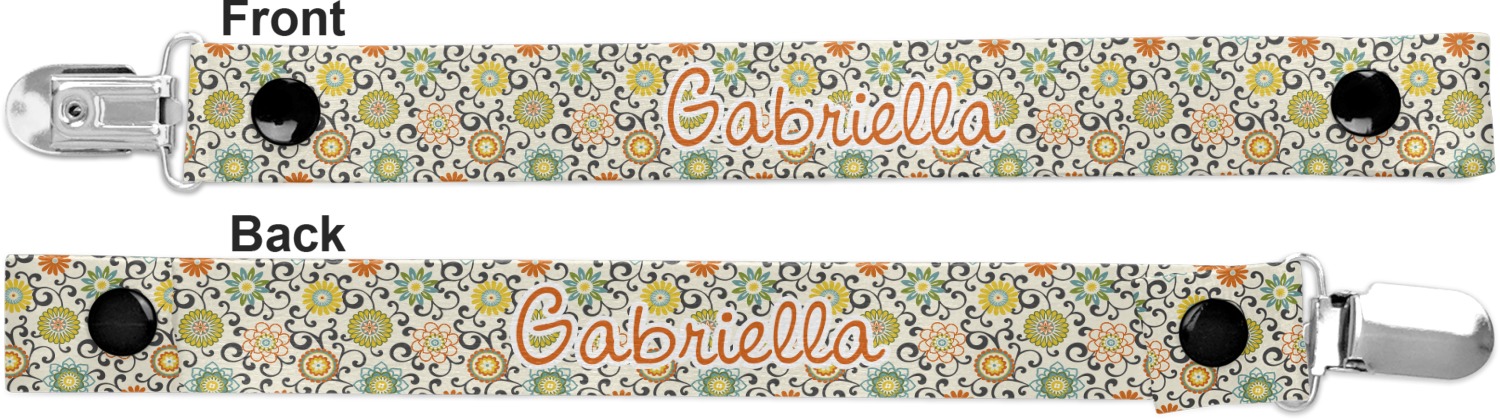 This personalized pacifier clip is the ideal size and measures at approximately 7.5 inches in length, when either end is snapped closed. On one end, you'll find a snap button. This button of your baby's pacifier holder is what can be attached to their pacifier to hold is securely in place. Simply open the snap, slip it through the pacifier opening, and snap it back into place. On the opposite end of this baby pacifier holder, you'll find a metal clip that can secure to a baby's collar or sleeve. This clip ensures that the strap stays in place, and that your baby's pacifier is always on hand.