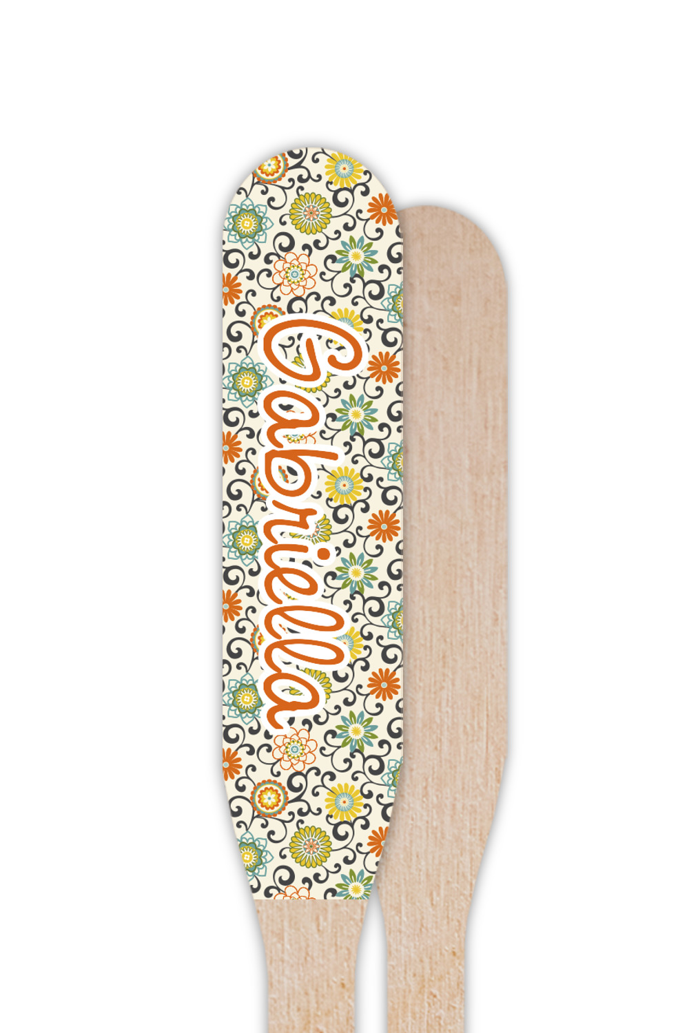 In this floral design the flowers of orange, green, blue, and yellow are connected with swirls of dark gray. The design has a classic ribbon in orange trimmed in off white. The decorative off white scalloped label is trimmed in orange. Add an initial and a name for that personal touch to pull the entire design together.