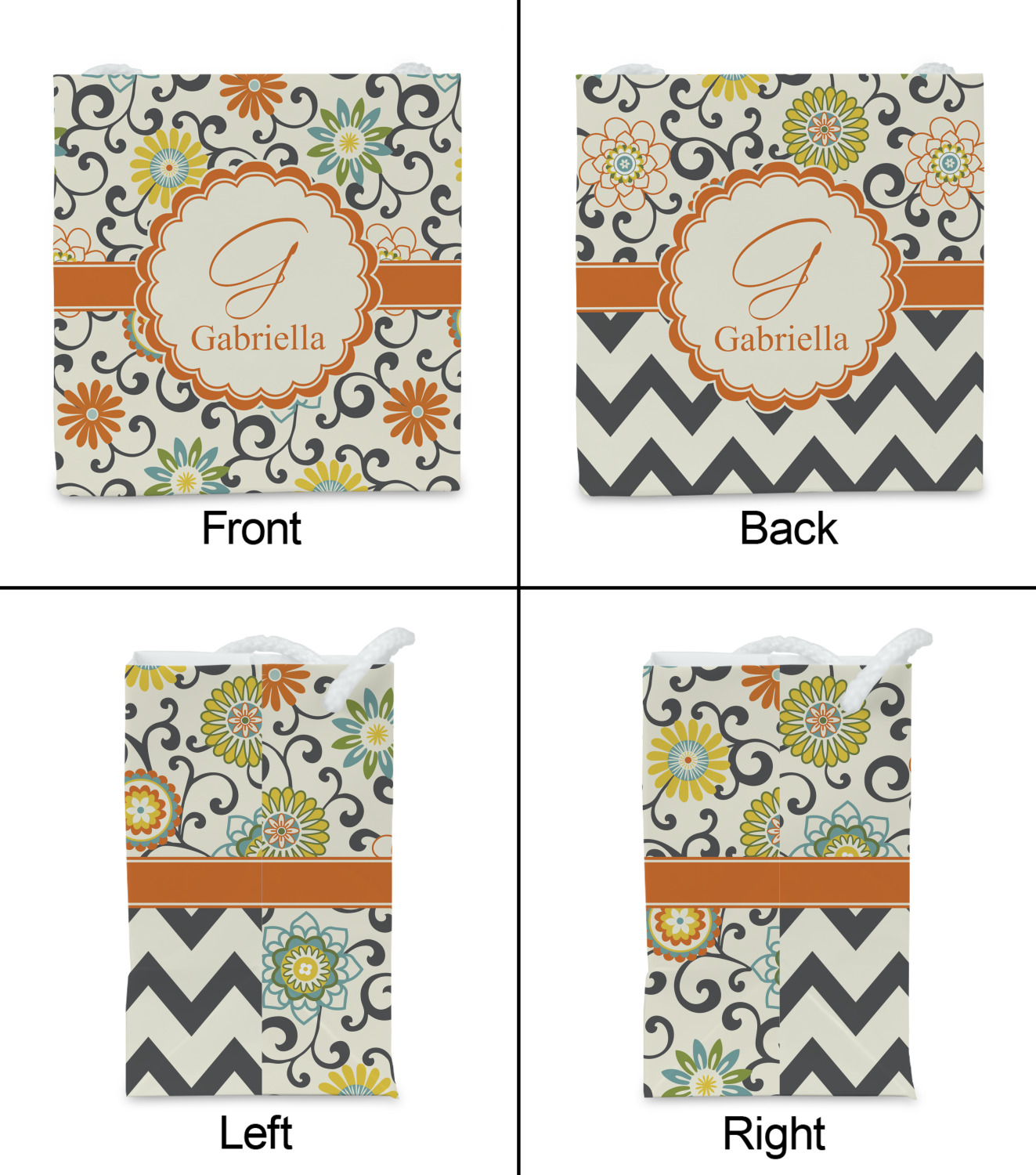 In this floral design the flowers of orange, green, blue, and yellow are connected with swirls of dark gray. The design has a classic ribbon in orange trimmed in off white. The decorative off white scalloped label is trimmed in orange. Add an initial and a name for that personal touch to pull the entire design together.