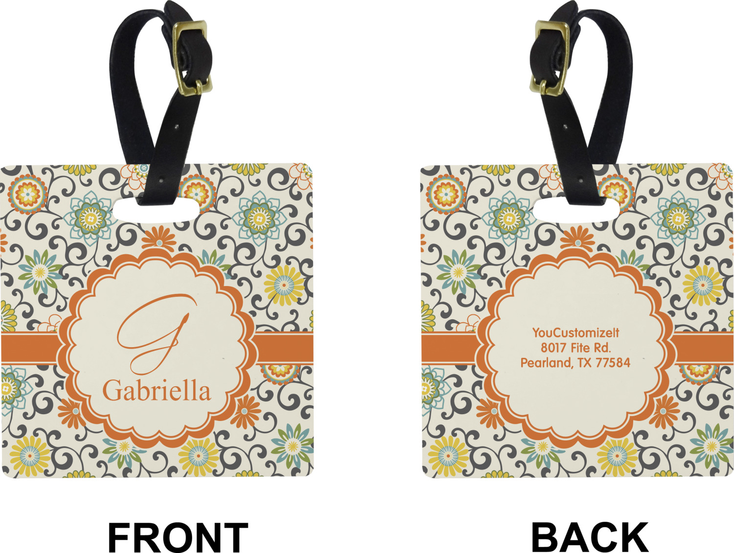 These personalized bag tags are sold in a variety of shapes, so that you may find the product that meets your vision exactly. We sell a round luggage tag, which measures at approximately 4" x 4". Our square luggage tag is about 3.5" x 3.5", while our rectangular version is 2.75" x 4 ".