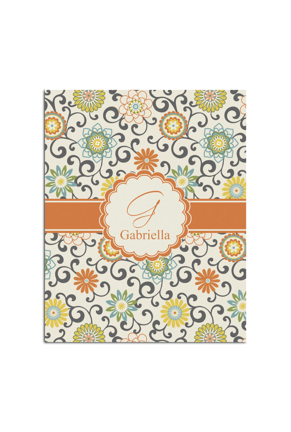 In this floral design the flowers of orange, green, blue, and yellow are connected with swirls of dark gray. The design has a classic ribbon in orange trimmed in off white. The decorative off white scalloped label is trimmed in orange. Add an initial and a name for that personal touch to pull the entire design together.