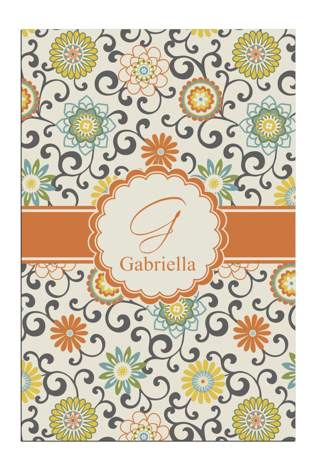 In this floral design the flowers of orange, green, blue, and yellow are connected with swirls of dark gray. The design has a classic ribbon in orange trimmed in off white. The decorative off white scalloped label is trimmed in orange. Add an initial and a name for that personal touch to pull the entire design together.