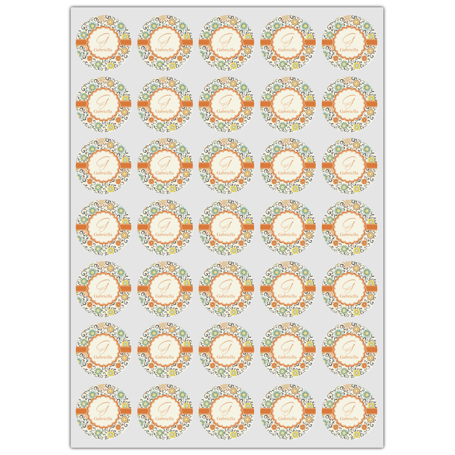 In this floral design the flowers of orange, green, blue, and yellow are connected with swirls of dark gray. The design has a classic ribbon in orange trimmed in off white. The decorative off white scalloped label is trimmed in orange. Add an initial and a name for that personal touch to pull the entire design together.