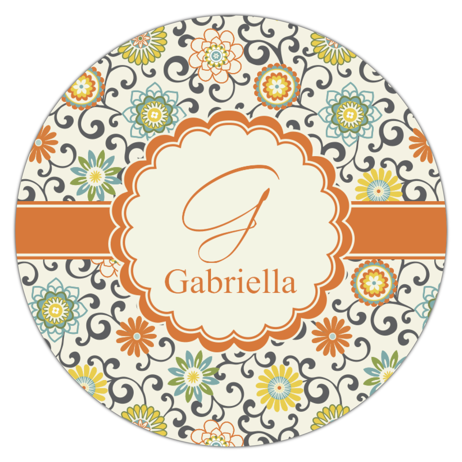 In this floral design the flowers of orange, green, blue, and yellow are connected with swirls of dark gray. The design has a classic ribbon in orange trimmed in off white. The decorative off white scalloped label is trimmed in orange. Add an initial and a name for that personal touch to pull the entire design together.