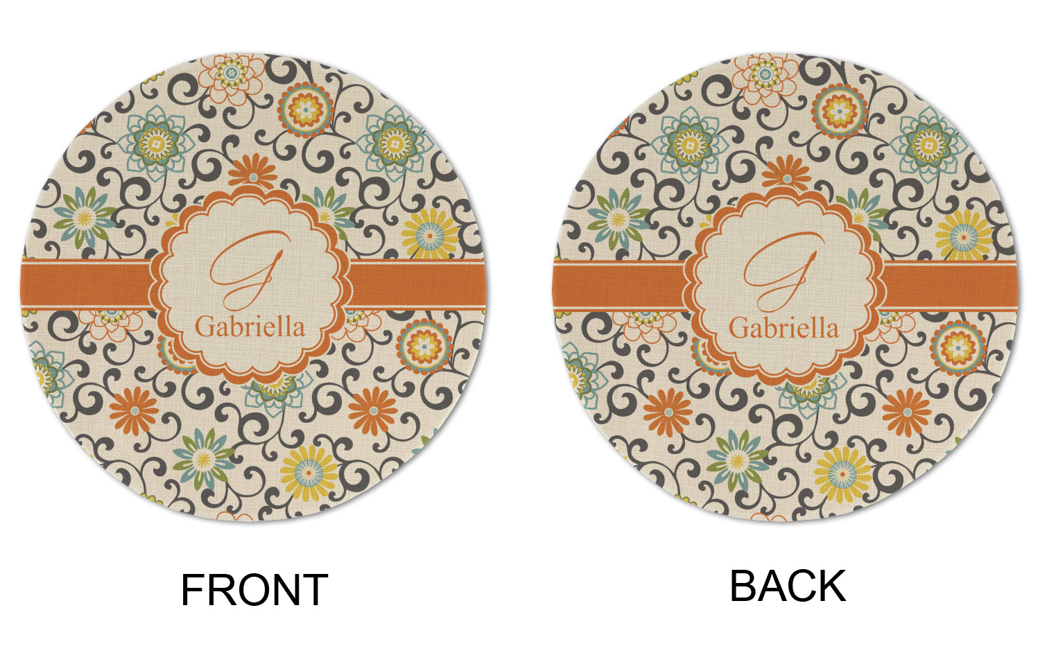 In this floral design the flowers of orange, green, blue, and yellow are connected with swirls of dark gray. The design has a classic ribbon in orange trimmed in off white. The decorative off white scalloped label is trimmed in orange. Add an initial and a name for that personal touch to pull the entire design together.