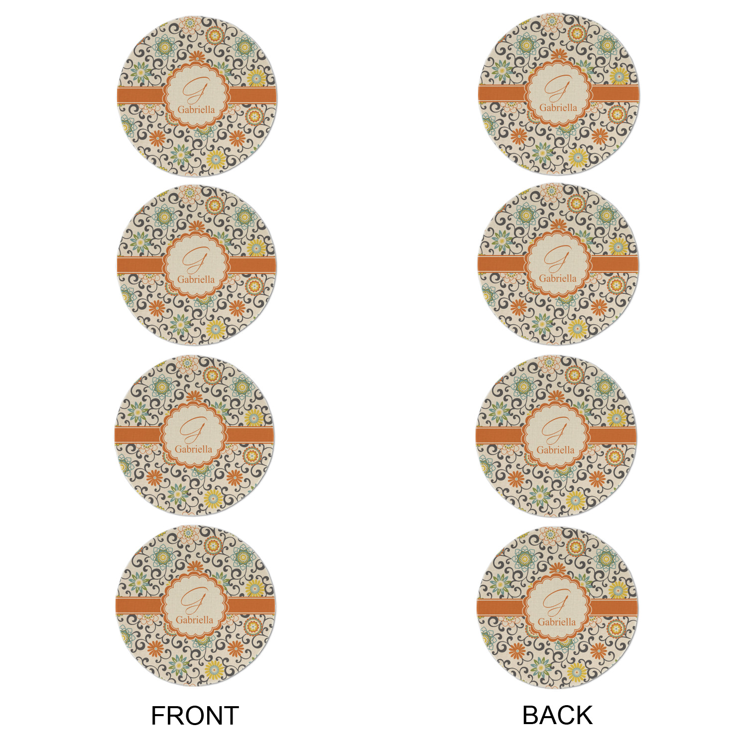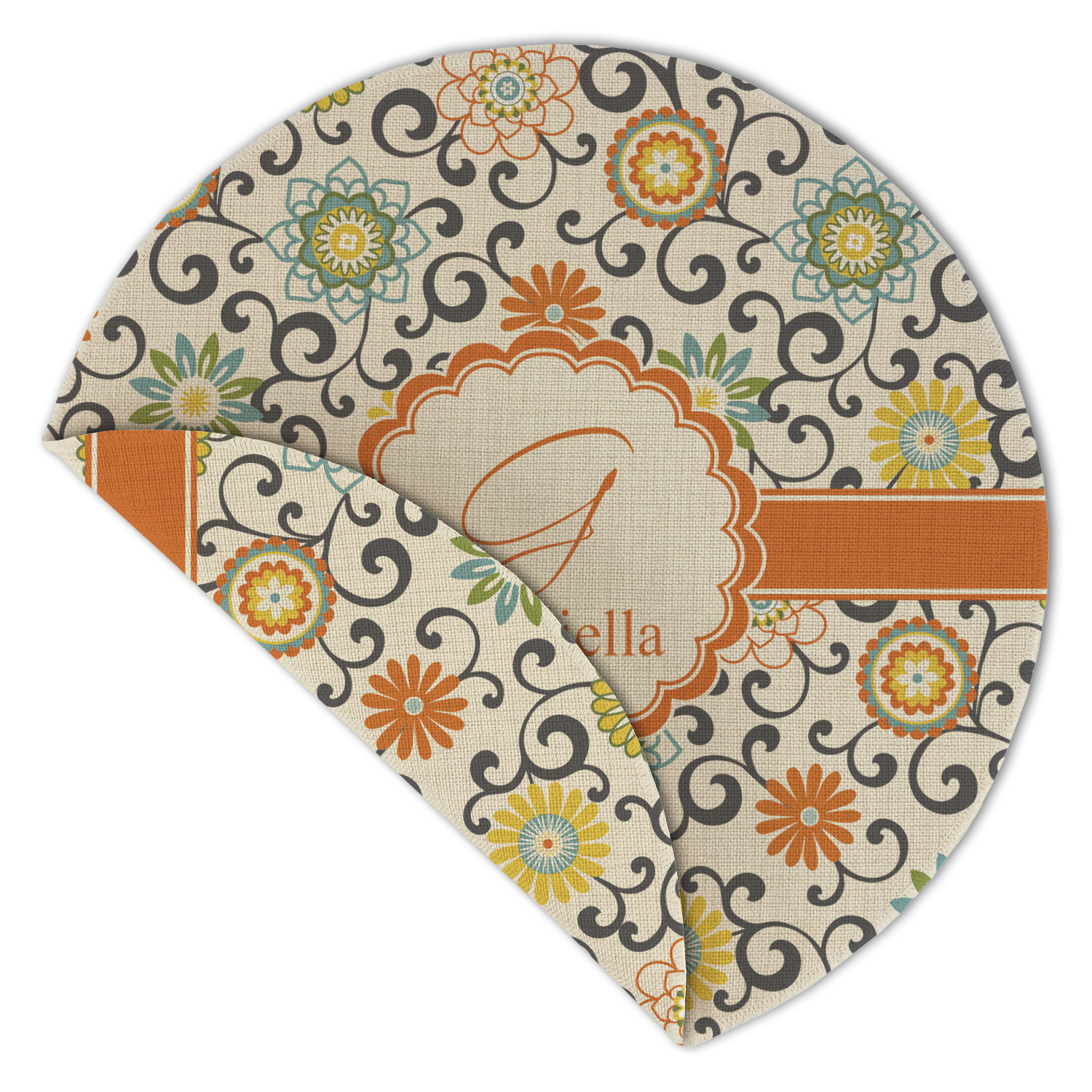 In this floral design the flowers of orange, green, blue, and yellow are connected with swirls of dark gray. The design has a classic ribbon in orange trimmed in off white. The decorative off white scalloped label is trimmed in orange. Add an initial and a name for that personal touch to pull the entire design together.