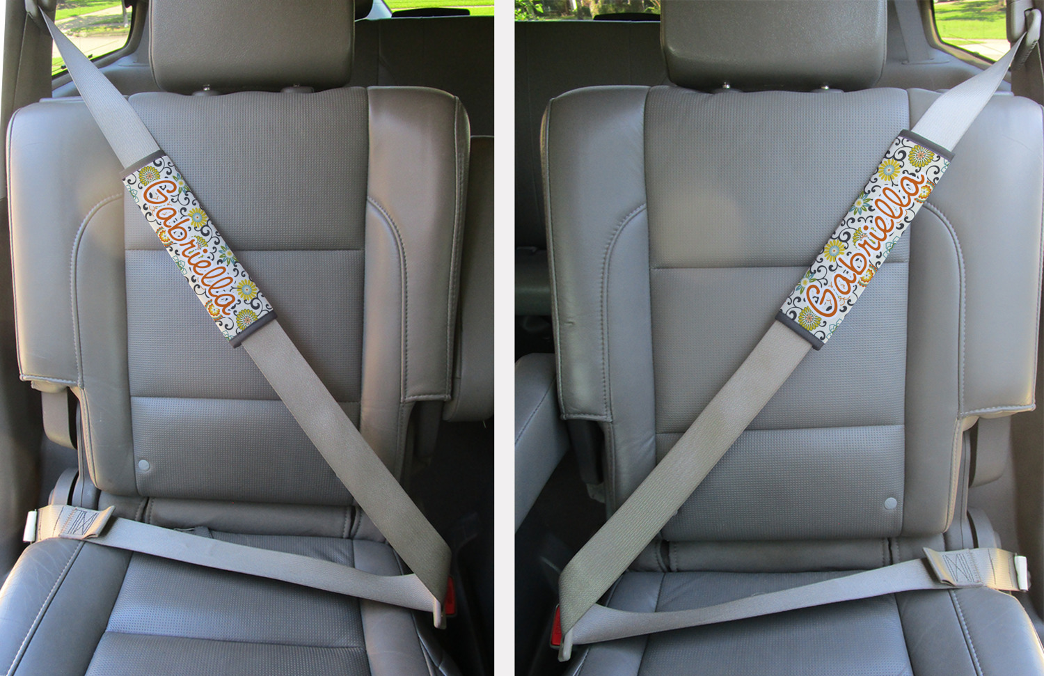 Made from neoprene, our seat belt strap covers wrap around the belt itself and have a Velcro tab for easy attachment and closure. The belt's edges are trimmed with a black polyester for a secure finish. Each cover is 9.5 by 7 inches when open and 9.5 by 2.5 inches when closed. We print your personalized design on the face of the seat belt pad.