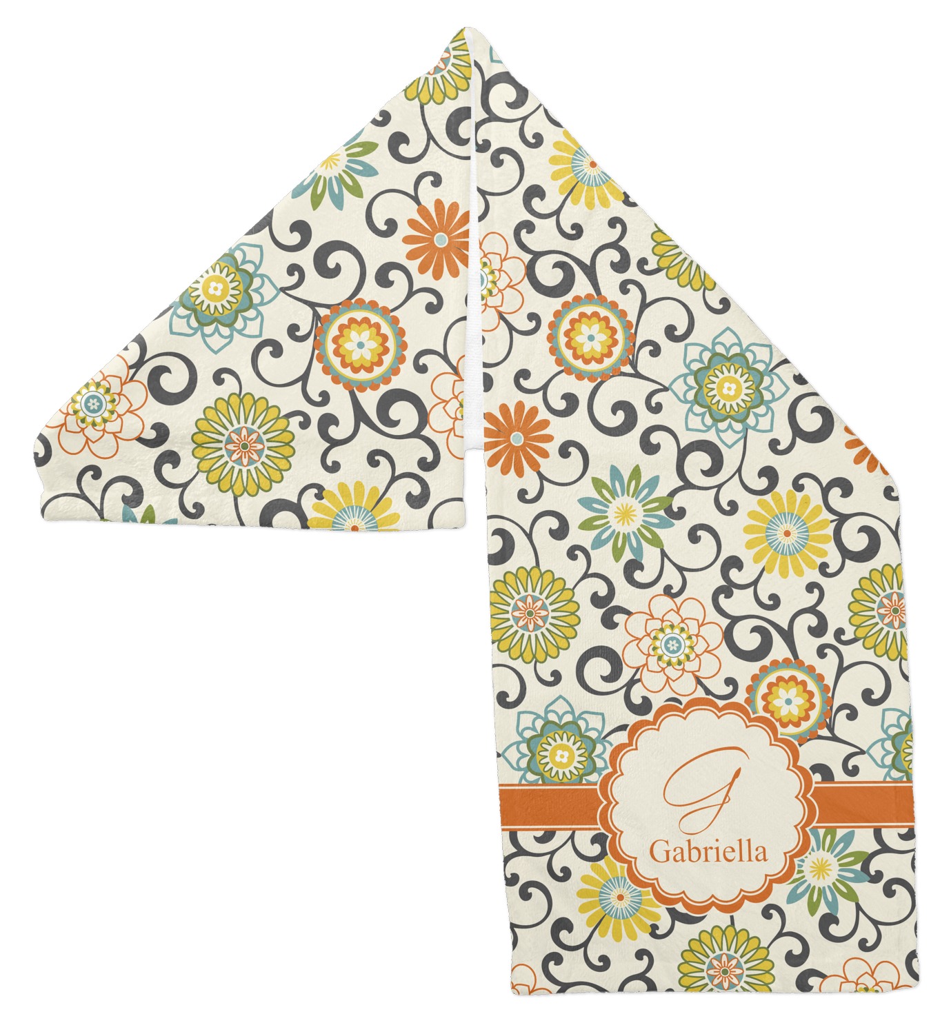 In this floral design the flowers of orange, green, blue, and yellow are connected with swirls of dark gray. The design has a classic ribbon in orange trimmed in off white. The decorative off white scalloped label is trimmed in orange. Add an initial and a name for that personal touch to pull the entire design together.