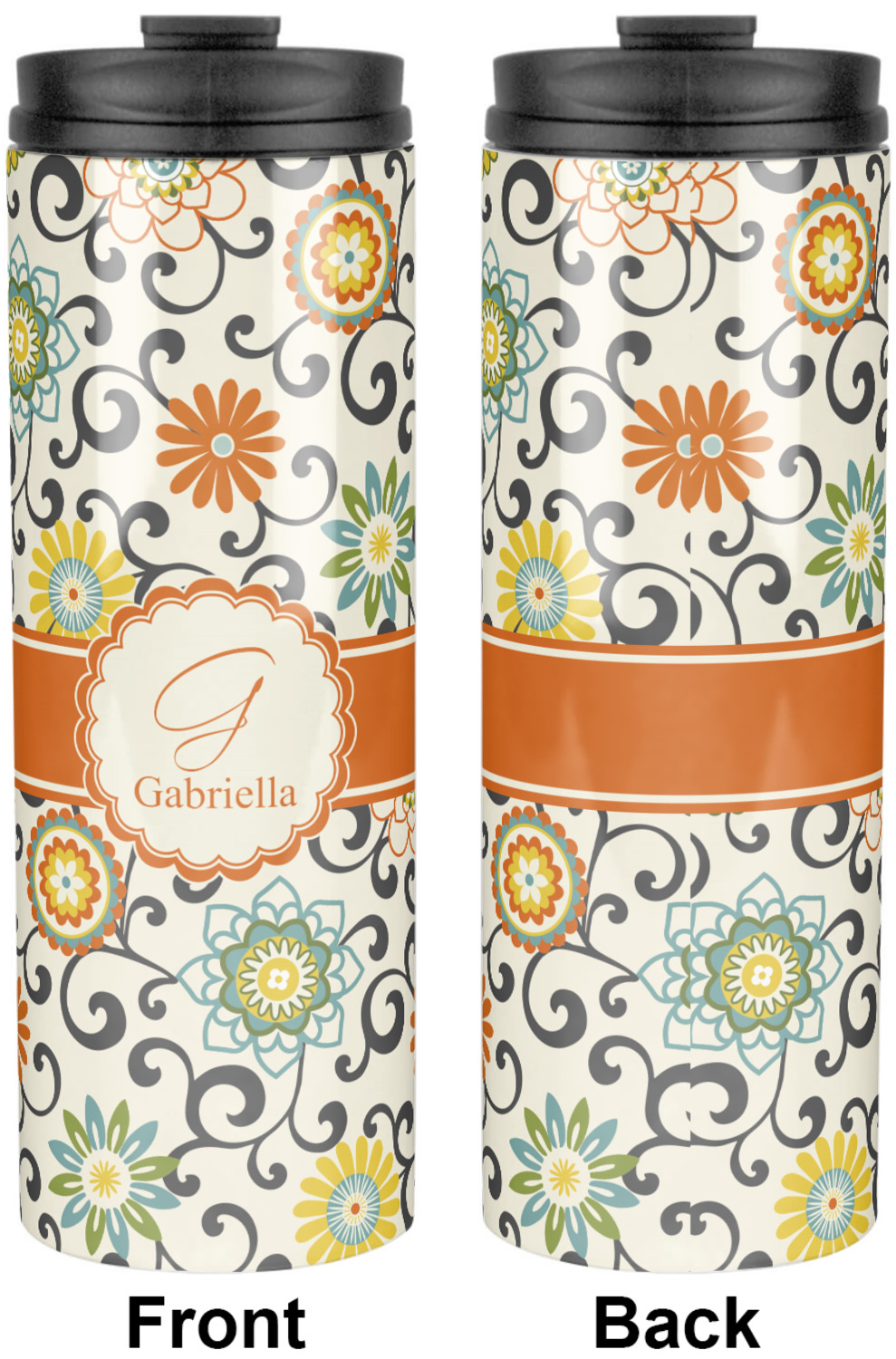 In this floral design the flowers of orange, green, blue, and yellow are connected with swirls of dark gray. The design has a classic ribbon in orange trimmed in off white. The decorative off white scalloped label is trimmed in orange. Add an initial and a name for that personal touch to pull the entire design together.