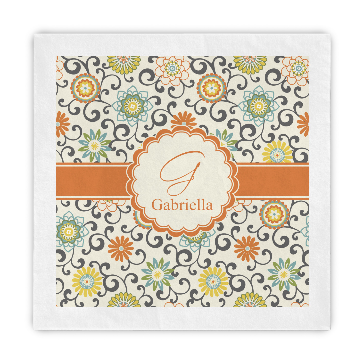 In this floral design the flowers of orange, green, blue, and yellow are connected with swirls of dark gray. The design has a classic ribbon in orange trimmed in off white. The decorative off white scalloped label is trimmed in orange. Add an initial and a name for that personal touch to pull the entire design together.