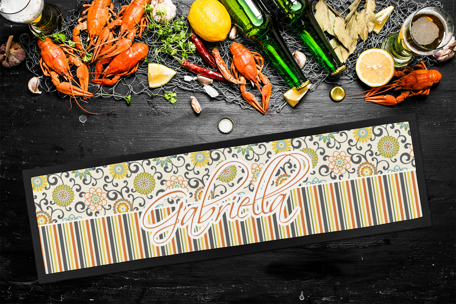 We have brought retro back to being relevant with this gorgeous swirls and floral pattern with a traditional stripe pairing. The top of the design renews the orange, green, blue, and yellow but adds a modern twist by using dark gray. The floral pattern is set on a background of white to make this print come to life. The bottom of the design has the classic stripe print using coordinating colors from the floral pattern