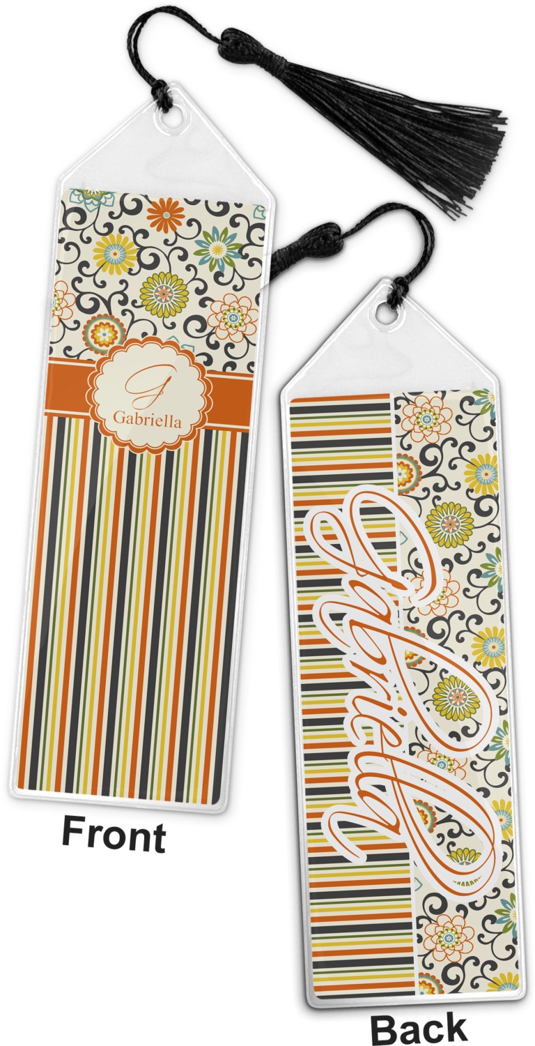 Your personalized bookmark is made of a sturdy, clear vinyl, and is approximately 7.5" x 2.25". We display your personalization on vinyl inserts that are placed on both sides. Accompanying each book marker is a black, fringe tassel that attaches to the reinforced, triangular header.