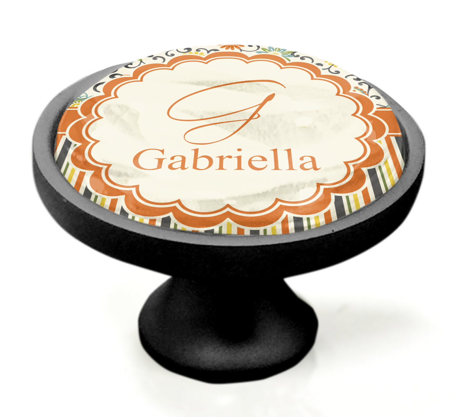 We sell these cabinet pulls in two different colors to better match your room's color scheme. We offer an oil-rubbed bronze base that is black in color, and a satin nickel option, which has a silver color. Your design is displayed across a high gloss vinyl insert that is placed on top of these cabinet handles. We then place a 1 inch thick glass cabochon atop the design, which seals the cabinet knob and makes the colors of your customization stand out. These custom cabinet knobs are approximately 1.3 inches in diameter. Your purchase includes a 1 inch screw that can be used to mount the knob to any cabinet in your home.