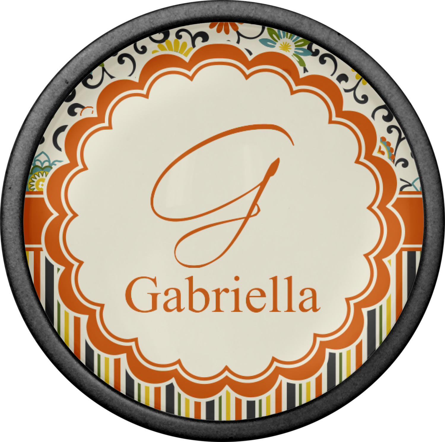 The design has a classic ribbon in orange trimmed in white. The decorative white scalloped label is trimmed in orange. Add an initial and a name for that personal touch to pull the entire design together.