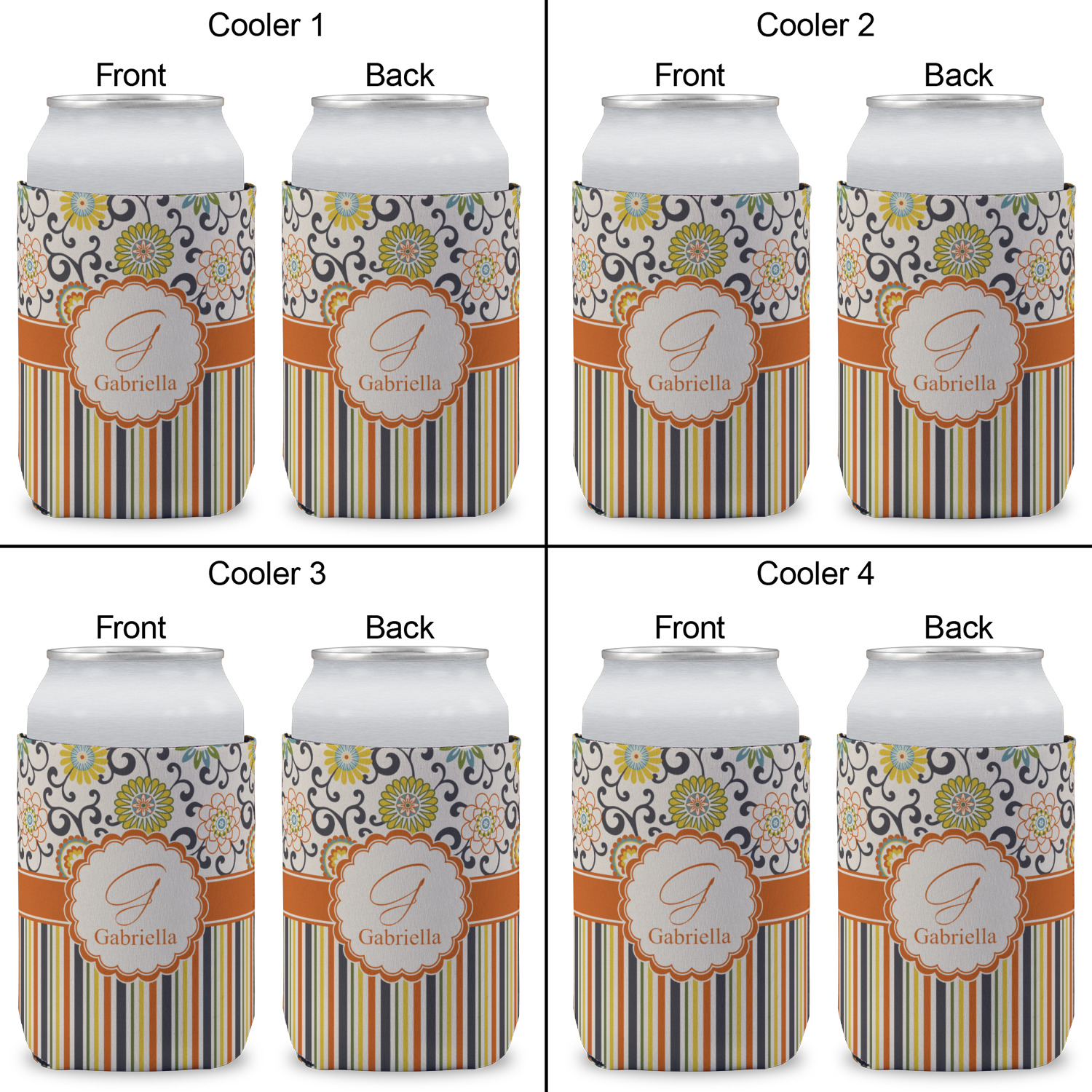 The design has a classic ribbon in orange trimmed in white. The decorative white scalloped label is trimmed in orange. Add an initial and a name for that personal touch to pull the entire design together.