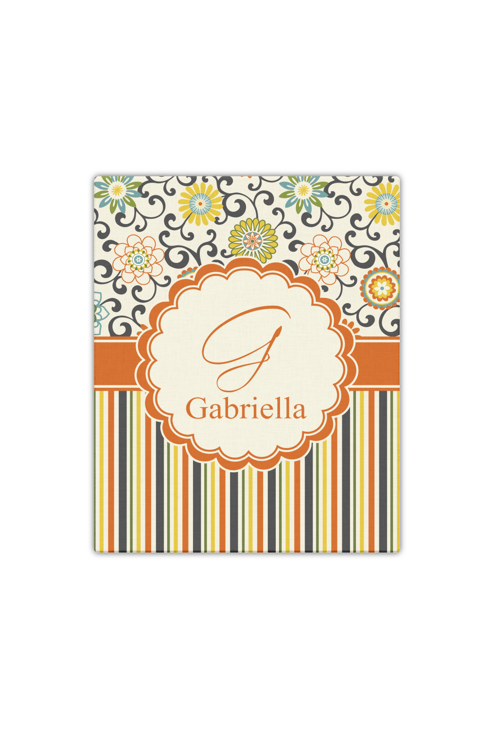 The design has a classic ribbon in orange trimmed in white. The decorative white scalloped label is trimmed in orange. Add an initial and a name for that personal touch to pull the entire design together.