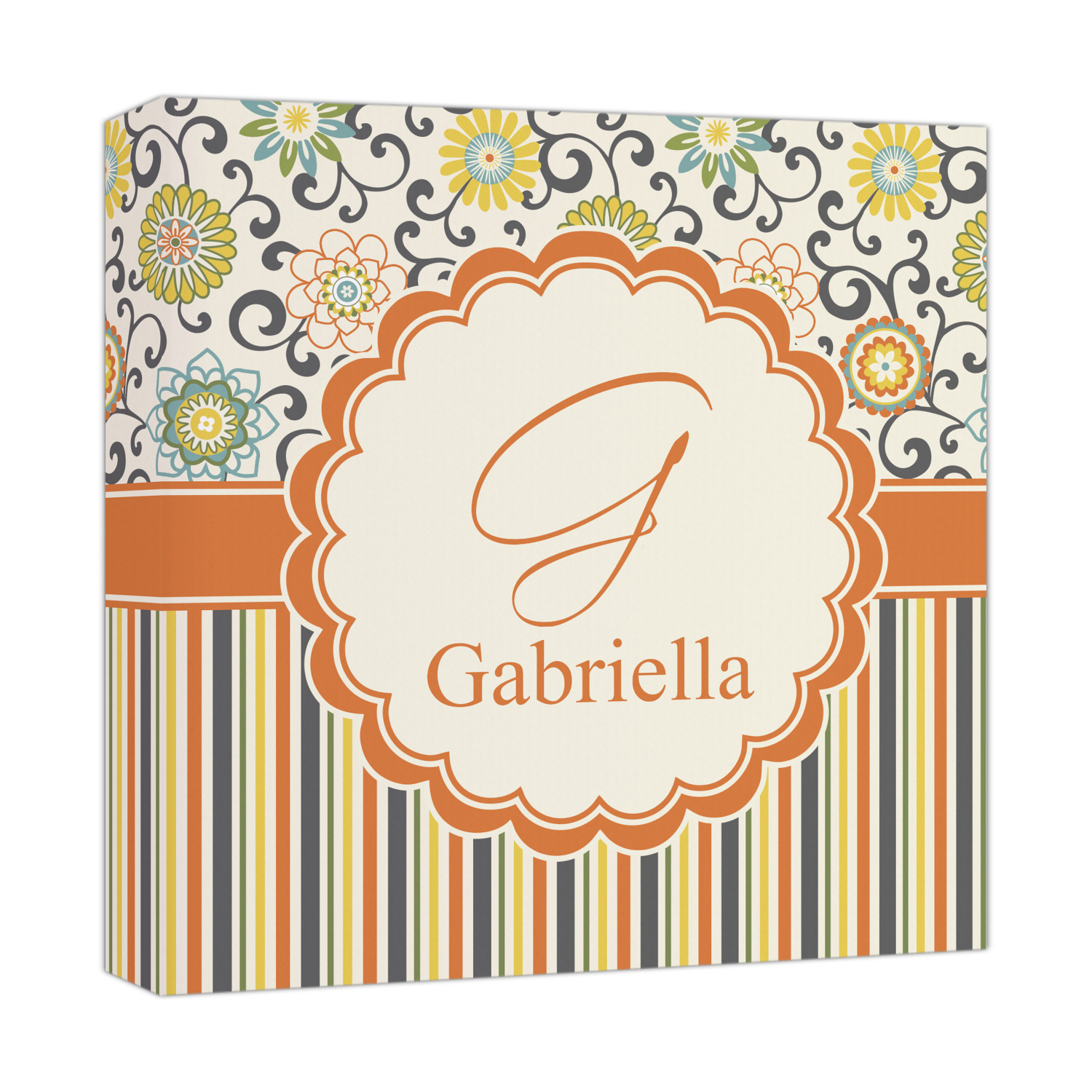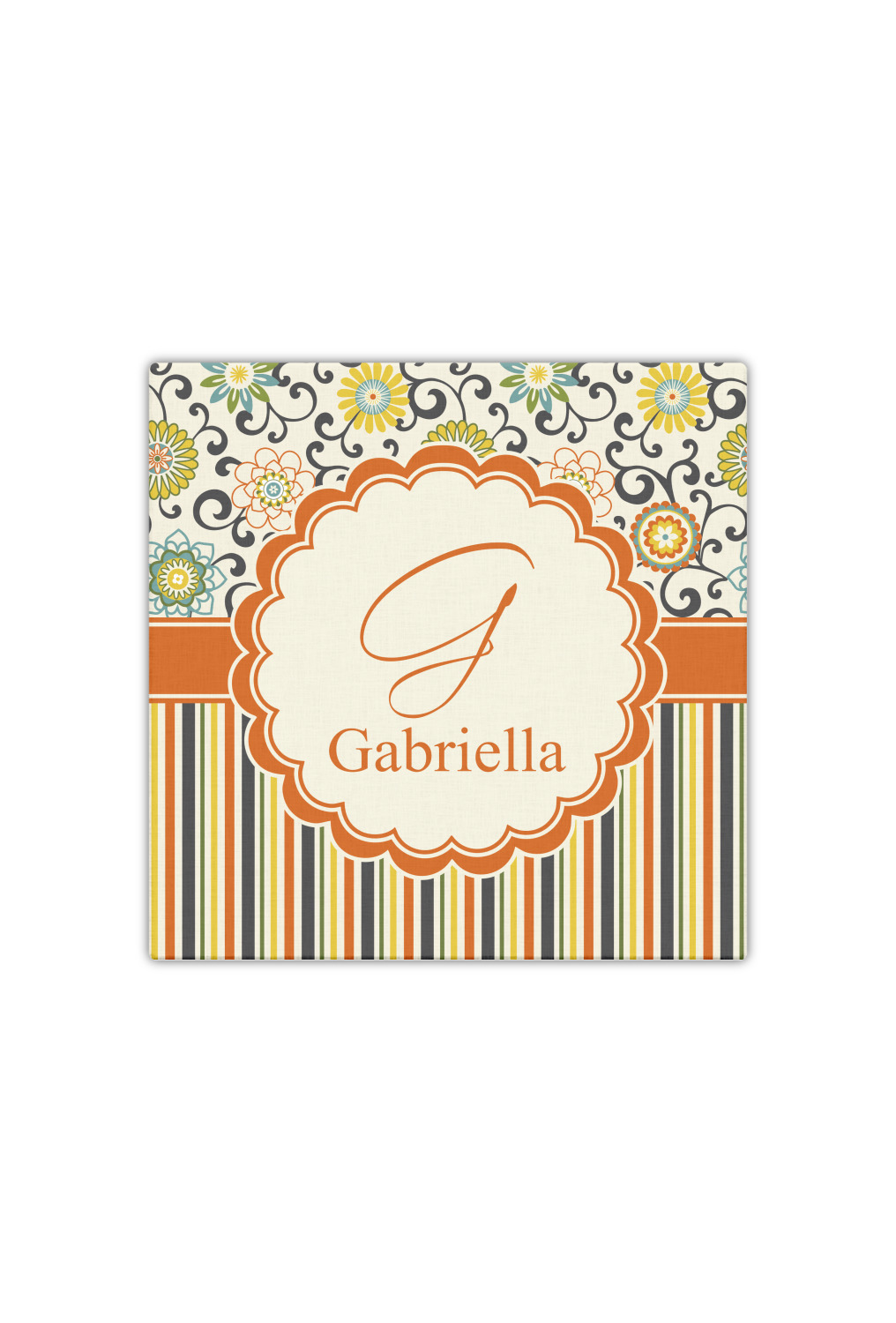 The design has a classic ribbon in orange trimmed in white. The decorative white scalloped label is trimmed in orange. Add an initial and a name for that personal touch to pull the entire design together.