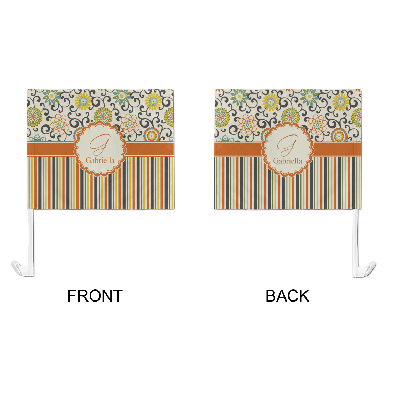 Our personalized flags are made from a durable, yet lightweight cloth that will proudly bear your logo or design of choice, while withstanding the outside elements. We have two size options - 8" x 11" and 11" x 15". Both come with a flag pole which includes a clip that secures the pole to the side window, whether it is rolled up or down. The flags are printed on both sides to display your design from all directions.
