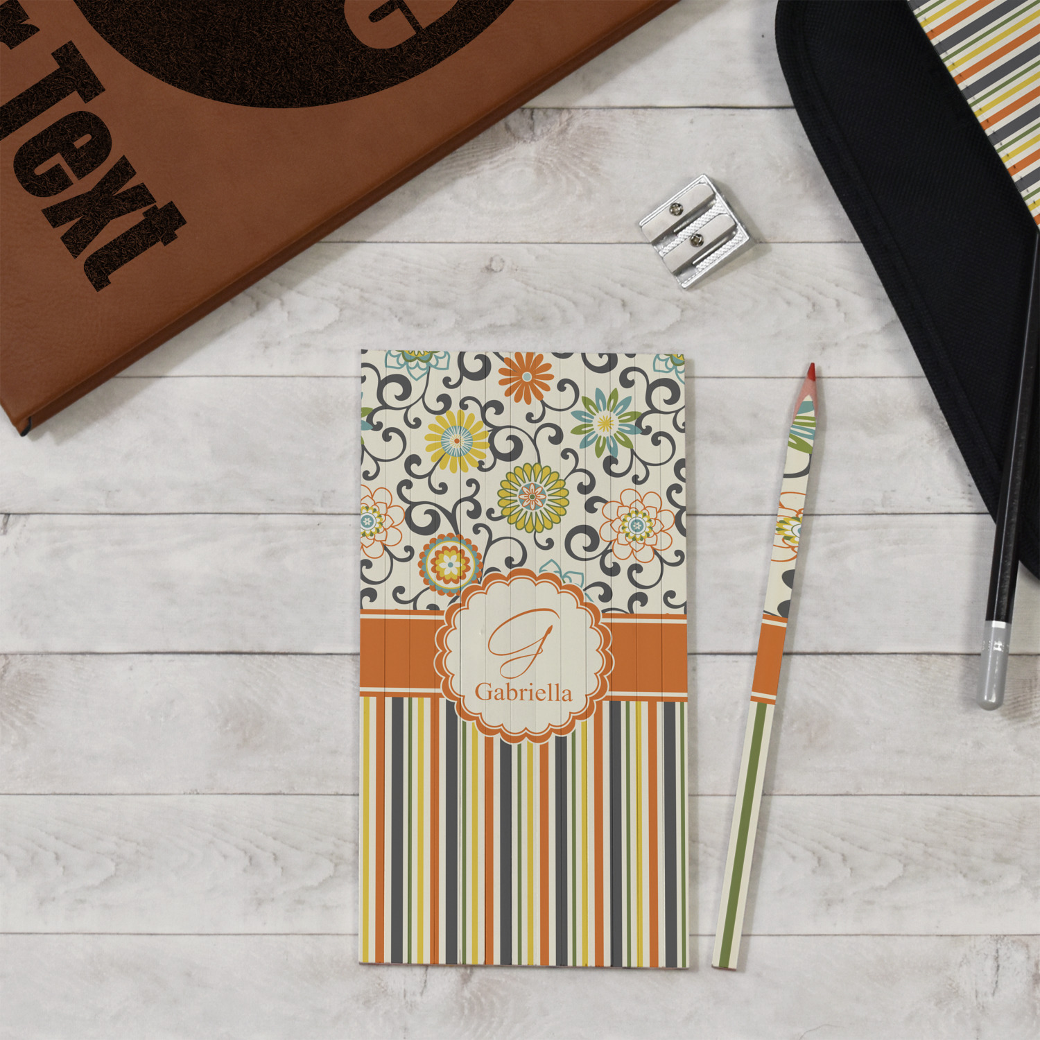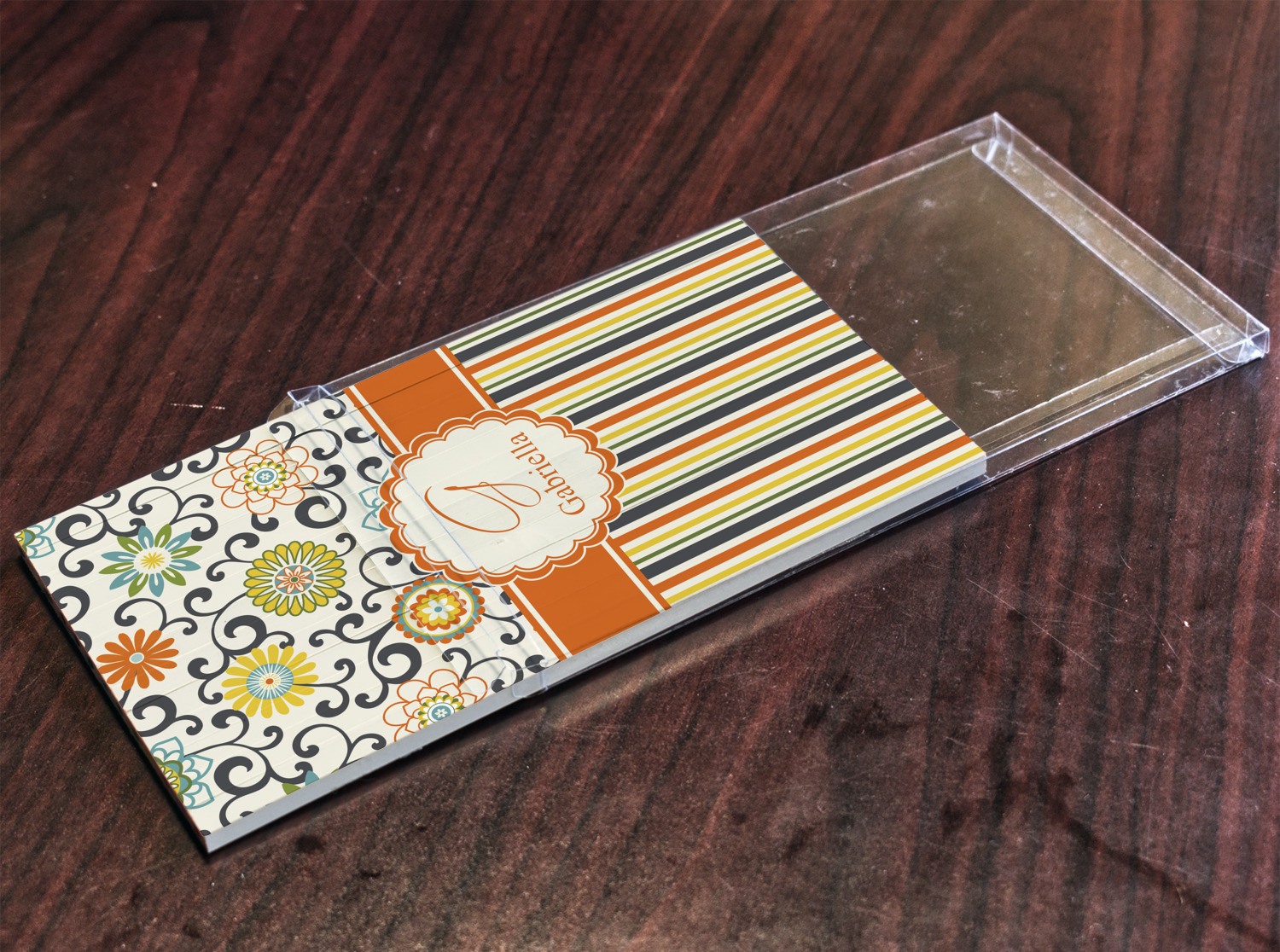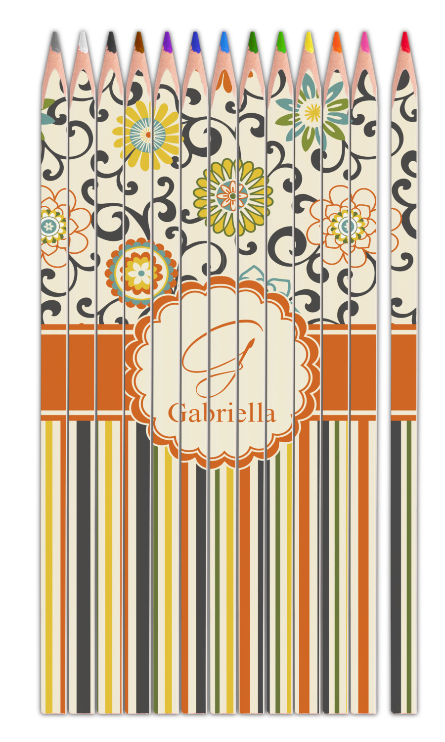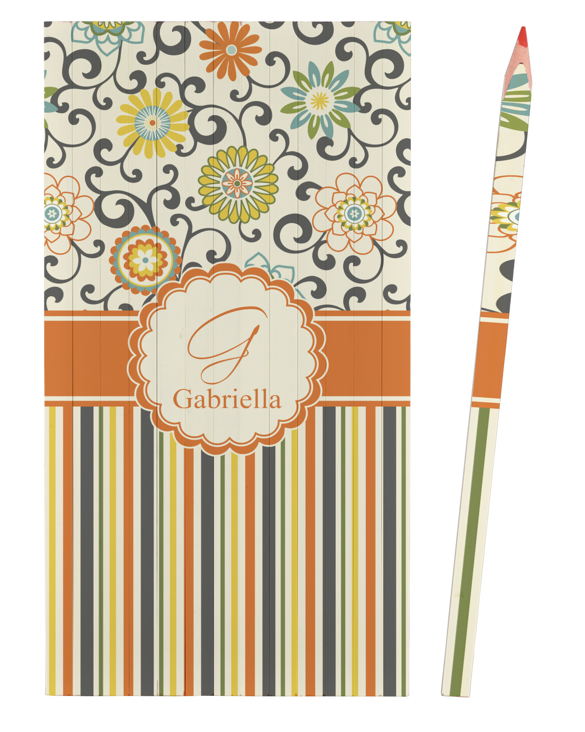 The design has a classic ribbon in orange trimmed in white. The decorative white scalloped label is trimmed in orange. Add an initial and a name for that personal touch to pull the entire design together.