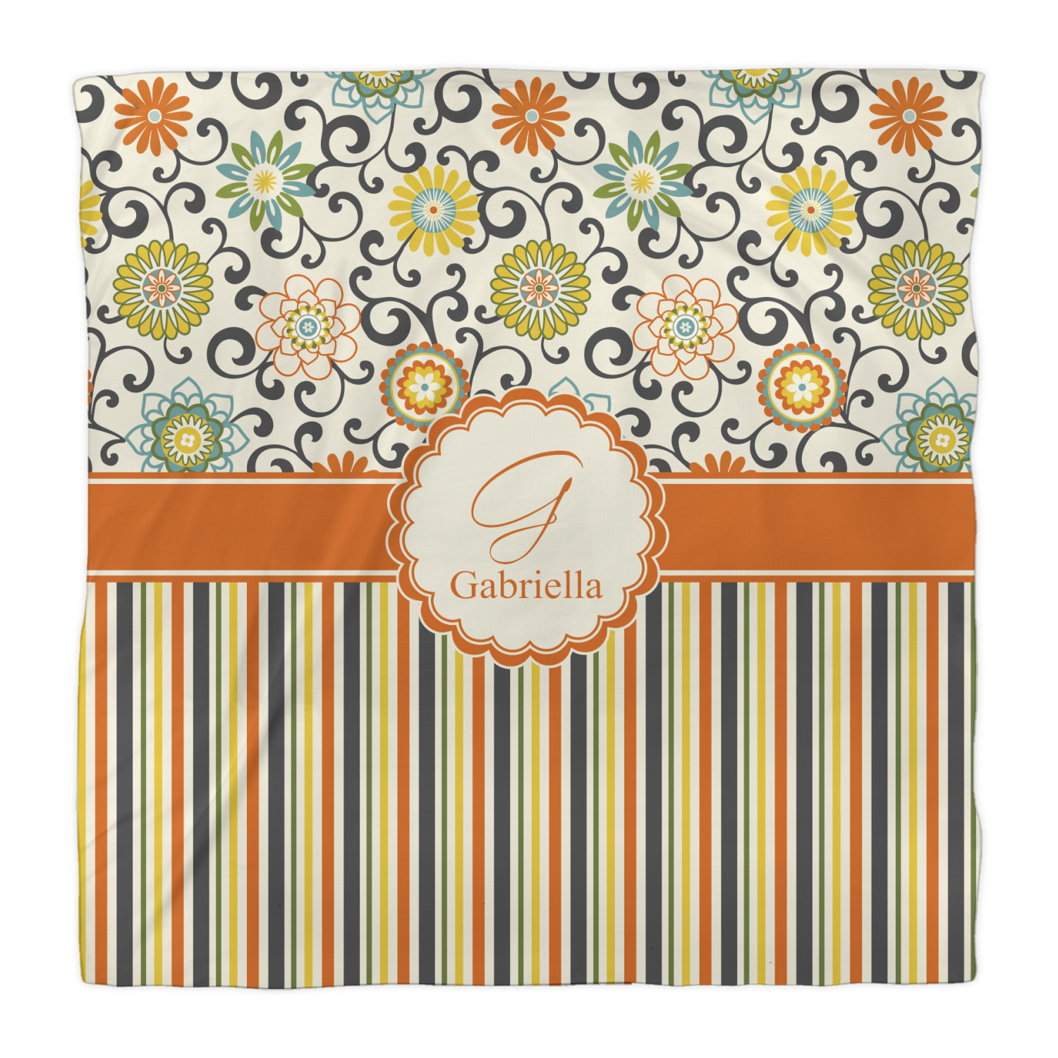 We have brought retro back to being relevant with this gorgeous swirls and floral pattern with a traditional stripe pairing. The top of the design renews the orange, green, blue, and yellow but adds a modern twist by using dark gray. The floral pattern is set on a background of white to make this print come to life. The bottom of the design has the classic stripe print using coordinating colors from the floral pattern