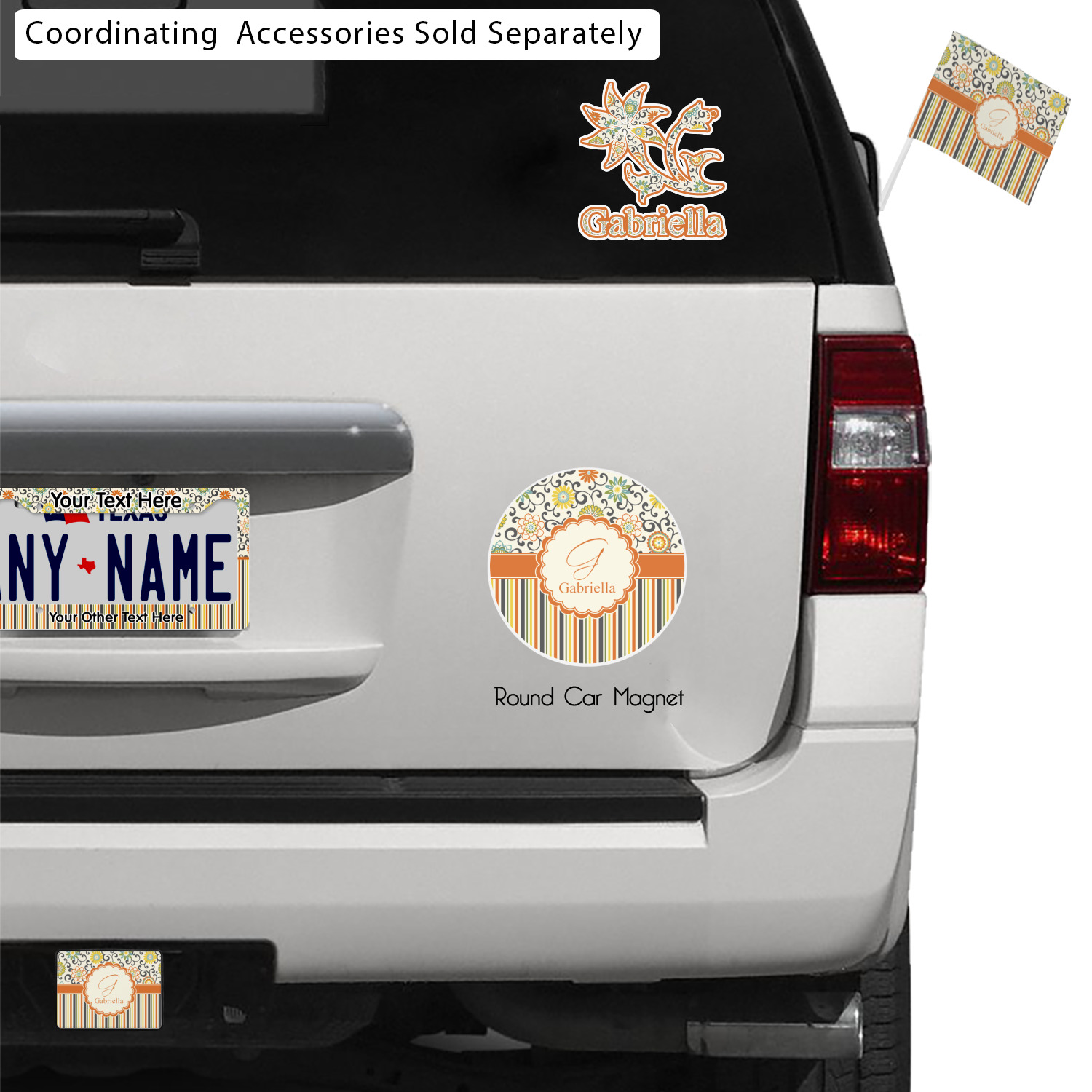 The design has a classic ribbon in orange trimmed in white. The decorative white scalloped label is trimmed in orange. Add an initial and a name for that personal touch to pull the entire design together.