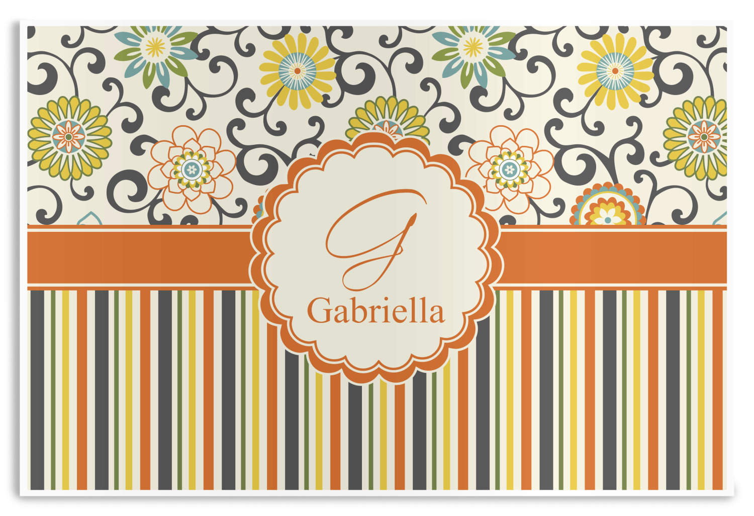 The design has a classic ribbon in orange trimmed in white. The decorative white scalloped label is trimmed in orange. Add an initial and a name for that personal touch to pull the entire design together.
