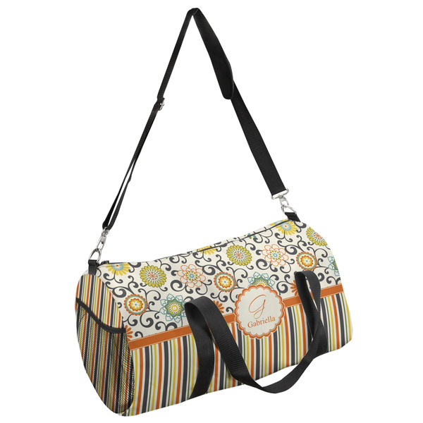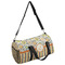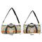 This duffle is a sturdy bag made of a canvas material. It comes in two sizes: Small (19"W x 9.5"H x 9.5"D) and Large (23"W x 12"H x 12"D). The bag is a cylindrical shape with a black adjustable strap and two handles. On one side is an elastic pouch to put a waterbottle or other small item. Your product will be sublimated with your design and is able to be designed on the front, back, and sides. Be sure to remember that the straps may cut into parts of your design if you upload your own artwork.
