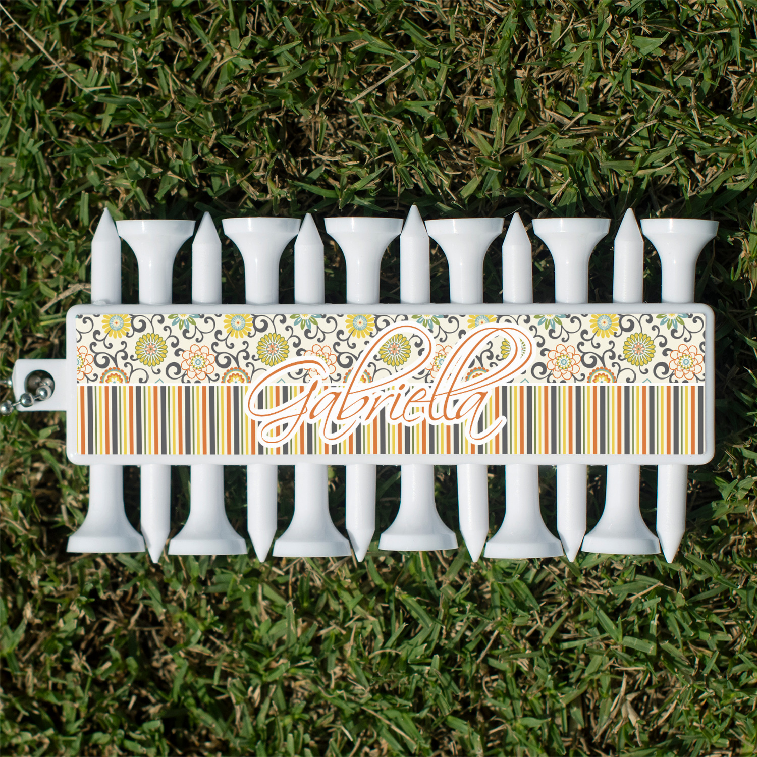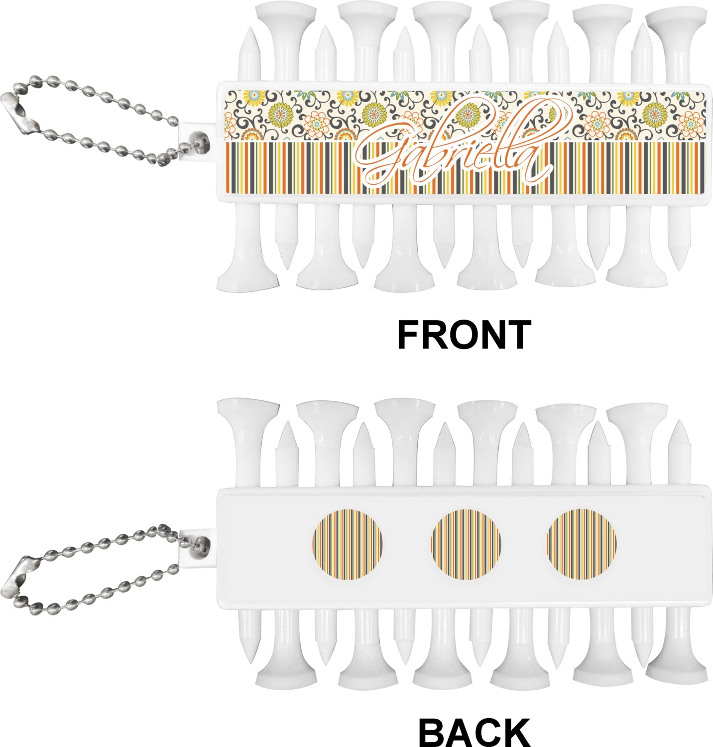 With 12 tees on a lightweight, portable key chain, it almost ensures a great 18 holes. Our tees are made of white plastic and are a little over 2". Design the front and the back of the golf tee holder. Pick from over a hundred designs, colors, and personalization styles! The set even comes with three removable ball markers as well!