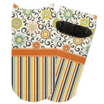 We have brought retro back to being relevant with this gorgeous swirls and floral pattern with a traditional stripe pairing. The top of the design renews the orange, green, blue, and yellow but adds a modern twist by using dark gray. The floral pattern is set on a background of white to make this print come to life. The bottom of the design has the classic stripe print using coordinating colors from the floral pattern
