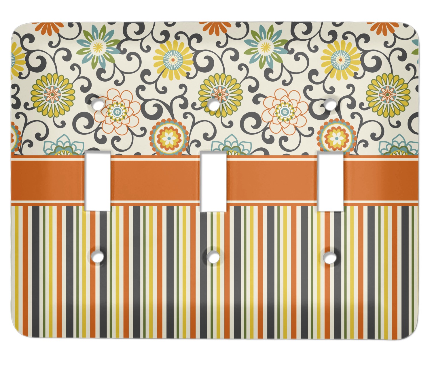 We have brought retro back to being relevant with this gorgeous swirls and floral pattern with a traditional stripe pairing. The top of the design renews the orange, green, blue, and yellow but adds a modern twist by using dark gray. The floral pattern is set on a background of white to make this print come to life. The bottom of the design has the classic stripe print using coordinating colors from the floral pattern