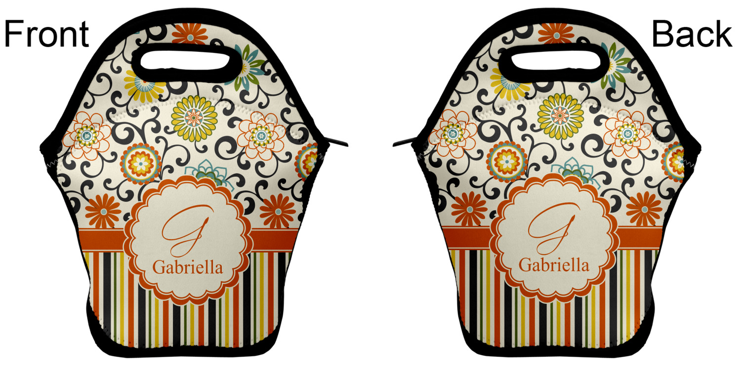 Our personalized lunch bags are made from a strong neoprene, and secure with a zipper closure that lines the top of the bag.The edges of the neoprene are sewn together with a heavy duty stitch, adding to the durability of the bag. The is accompanied by a reinforced handle at its top, for the easy transport of your lunch. We display your personalization across both the front and back of this neoprene lunch bag, while the remaining sides are a sleek black in color. Each bag measures at 13.5 inches tall, and 11.5 inches wide.