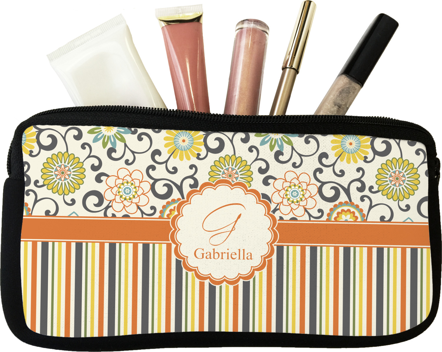 Our personalized makeup bags are available in many different designs, patterns and colors - so you are sure to find one that will love. They are made of neoprene (same material as wet-suits) and thus are water resistant, so spillages in your makeup bag will not end up all over you purse. They are customized on one side and are black on the other side and the zipper is black as well.