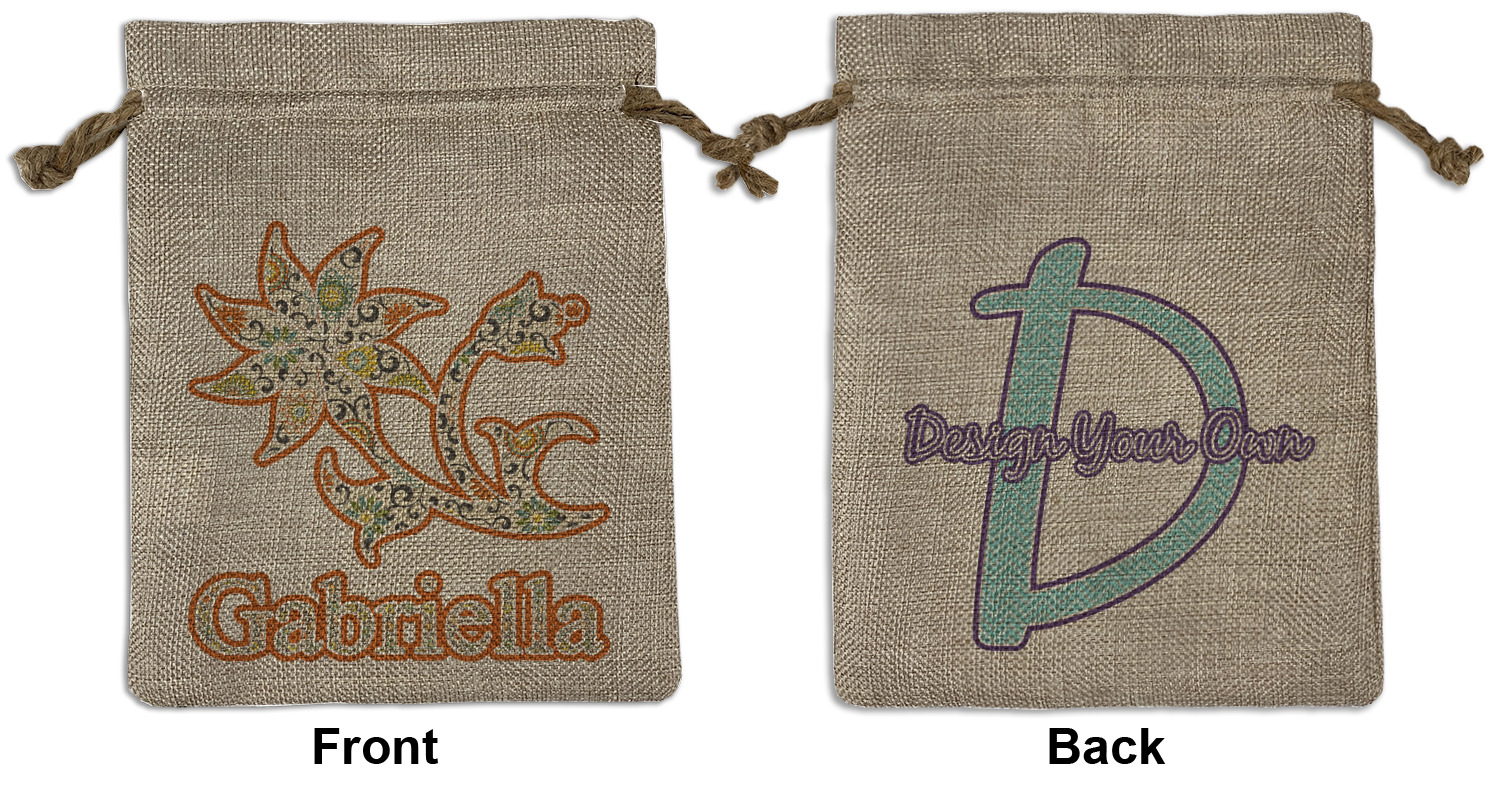 We sell our Burlap Gift Bags in 3 variant sized bags. Made with burlap polyester, each personalized bag can be secured with a twine drawstring pull. Your custom design is available to print on one side or both sides - completely up to you! The sizes of the bags measure approximately 4.5" x 6.5" for the smallest size, 6.5" x 8.0" for the medium size, and 6.5" x 13.5" for the large-sized bag.