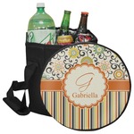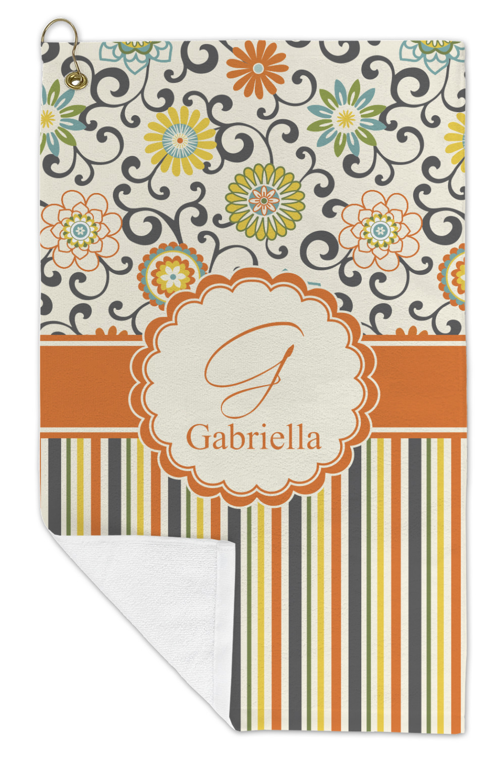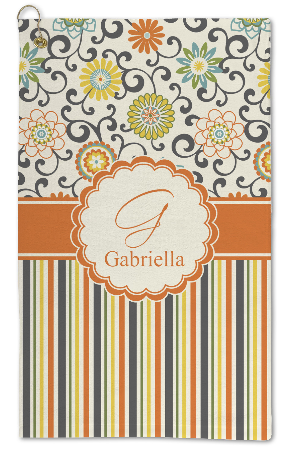 The design has a classic ribbon in orange trimmed in white. The decorative white scalloped label is trimmed in orange. Add an initial and a name for that personal touch to pull the entire design together.